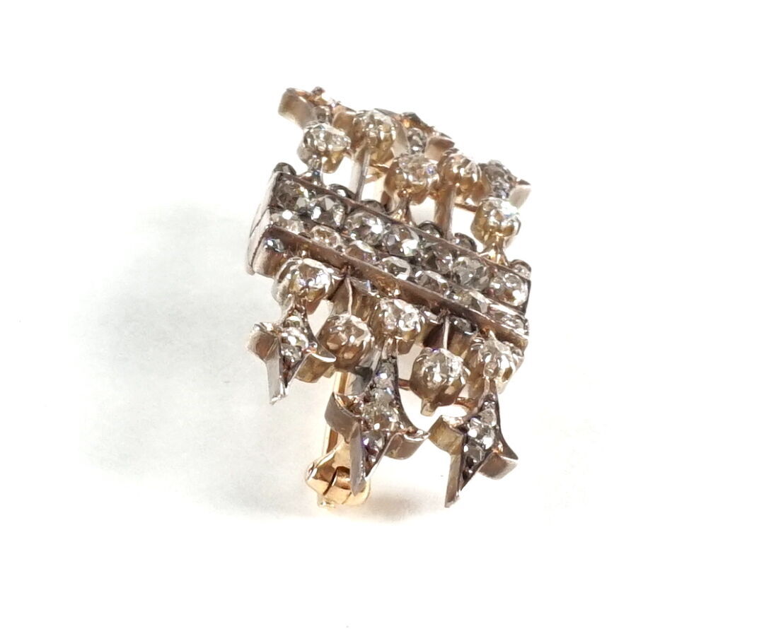 Broche rectangulaire ajourée en or jaune 18K (750/oo) et argent (800/oo), à décor de motifs de fers de lance, entièrement sertie de diamants taille ancienne et taille rose, L. 4.7 cm (remontage et restauration, probablement 2 clips de revers de veste assemblés, un diamant desserti mais présent). Poids brut : 12.4 g environ.