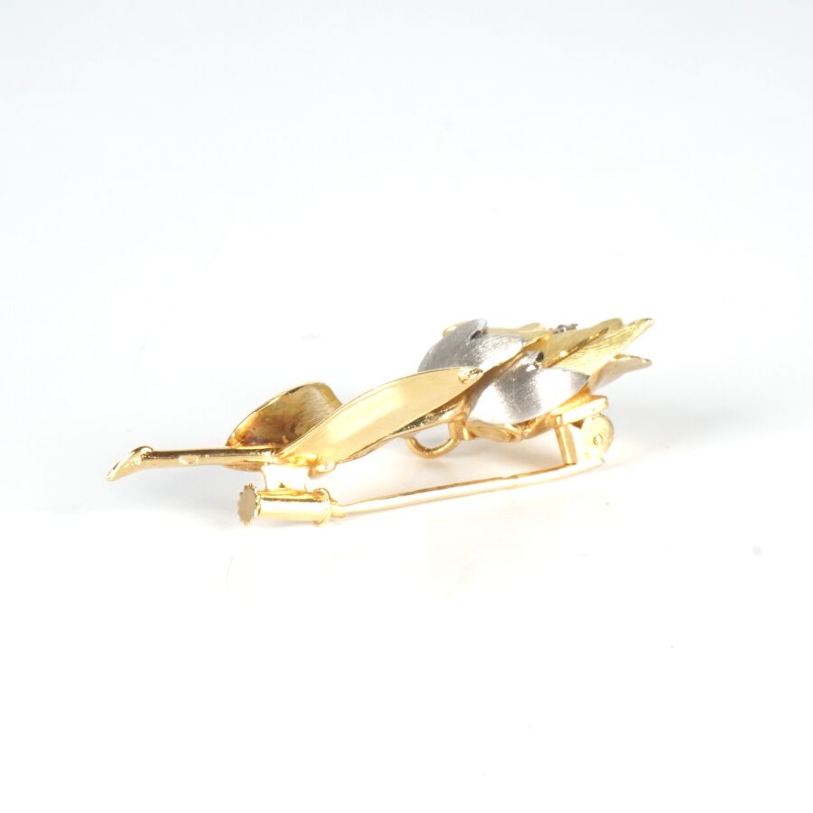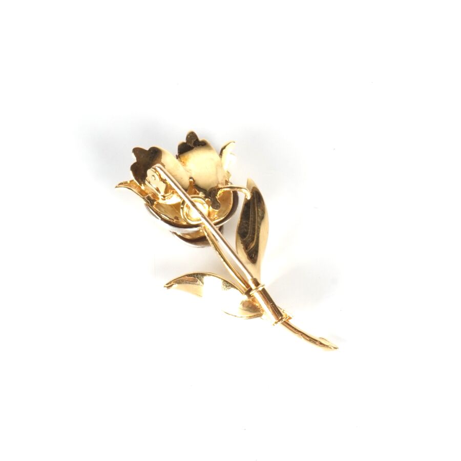 Broche "Tulipe" en or 2 tons 18K (750/oo) finement ciselé, sertie de 3 diamants formant pistils (D. 1.2 mm), H. 4.3 cm. Larg. 2 cm environ. Poids brut : 6.8 g environ