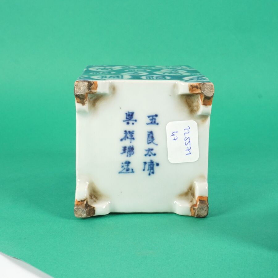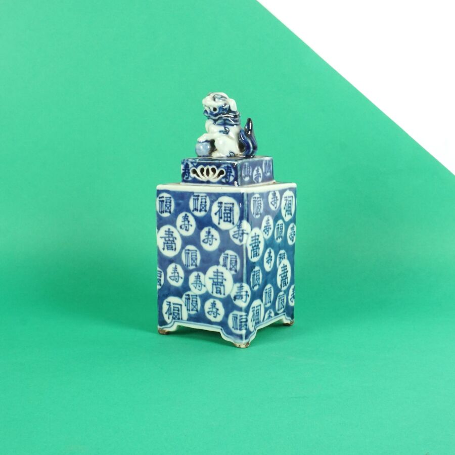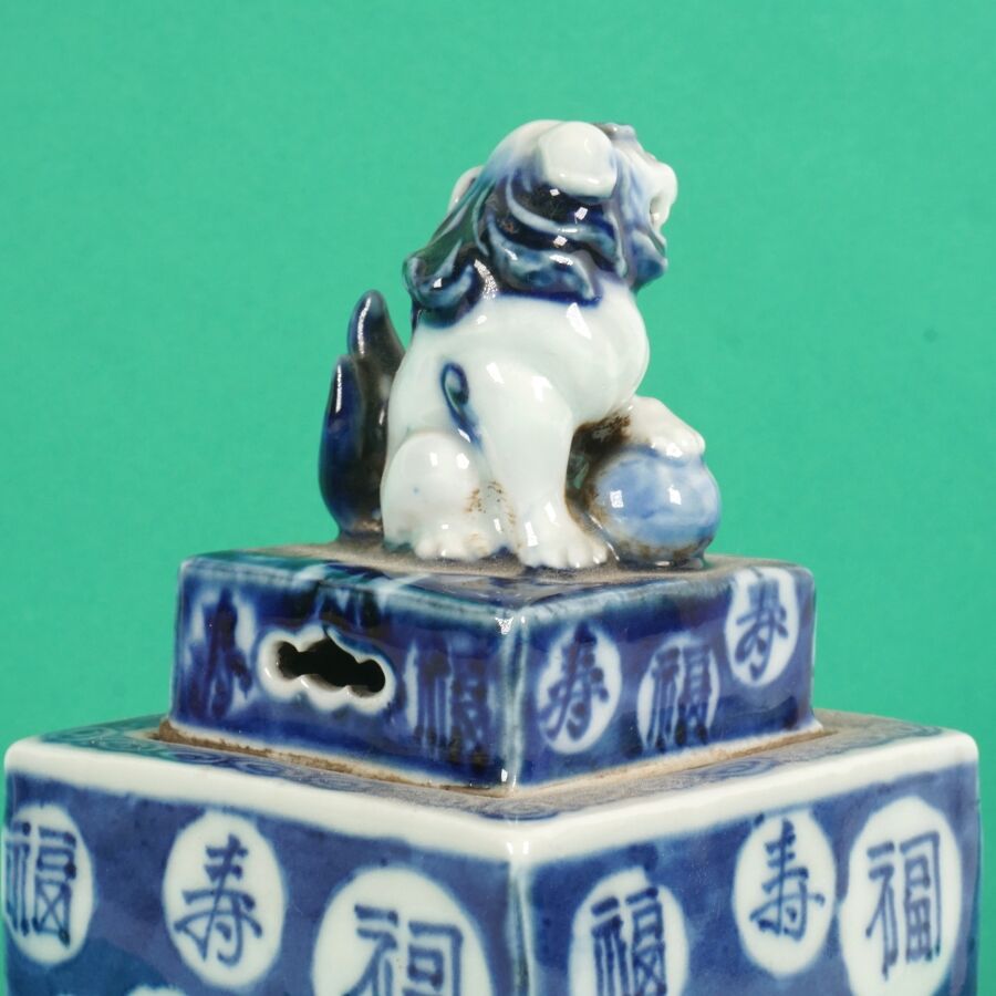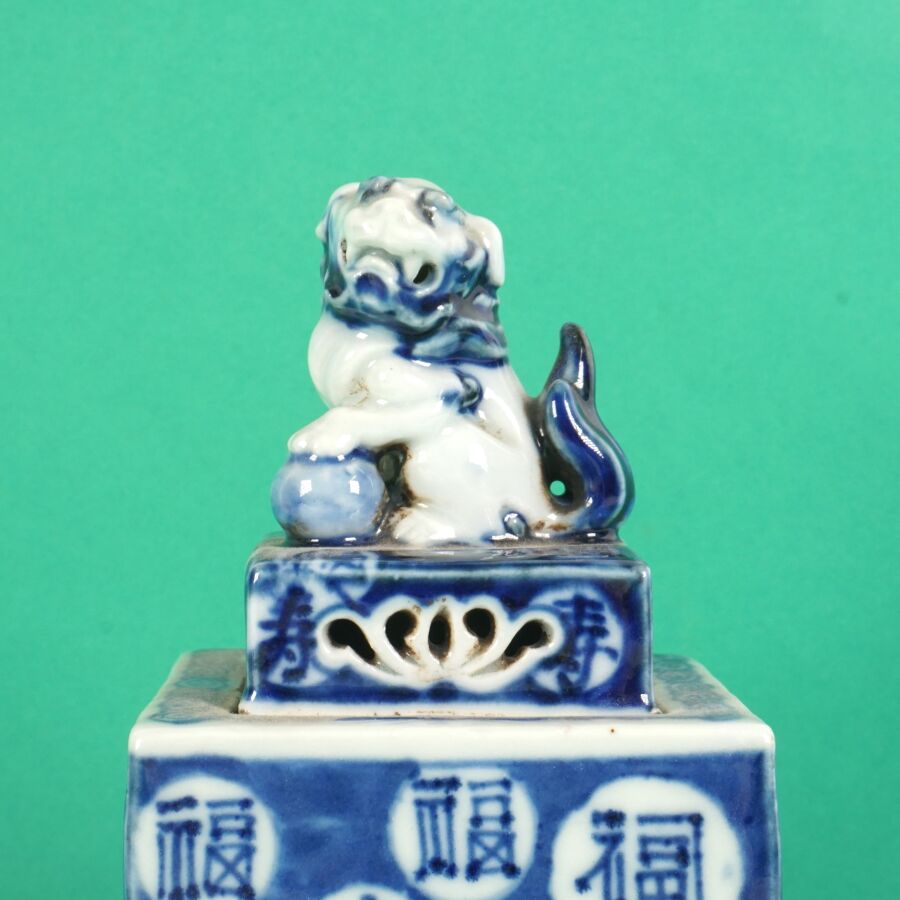 Brûle-parfum de forme quadrangulaire, en porcelaine bleu blanc, à décor de calligraphies en médaillons, la prise surmontée d'un shishi, calligraphies au revers Gorodaiyu go Shonzui (Nom Chinois " Wu Xiangrui "), Japon, 19ème siècle H. 16,5 x 6.9 x 6.9 cm.