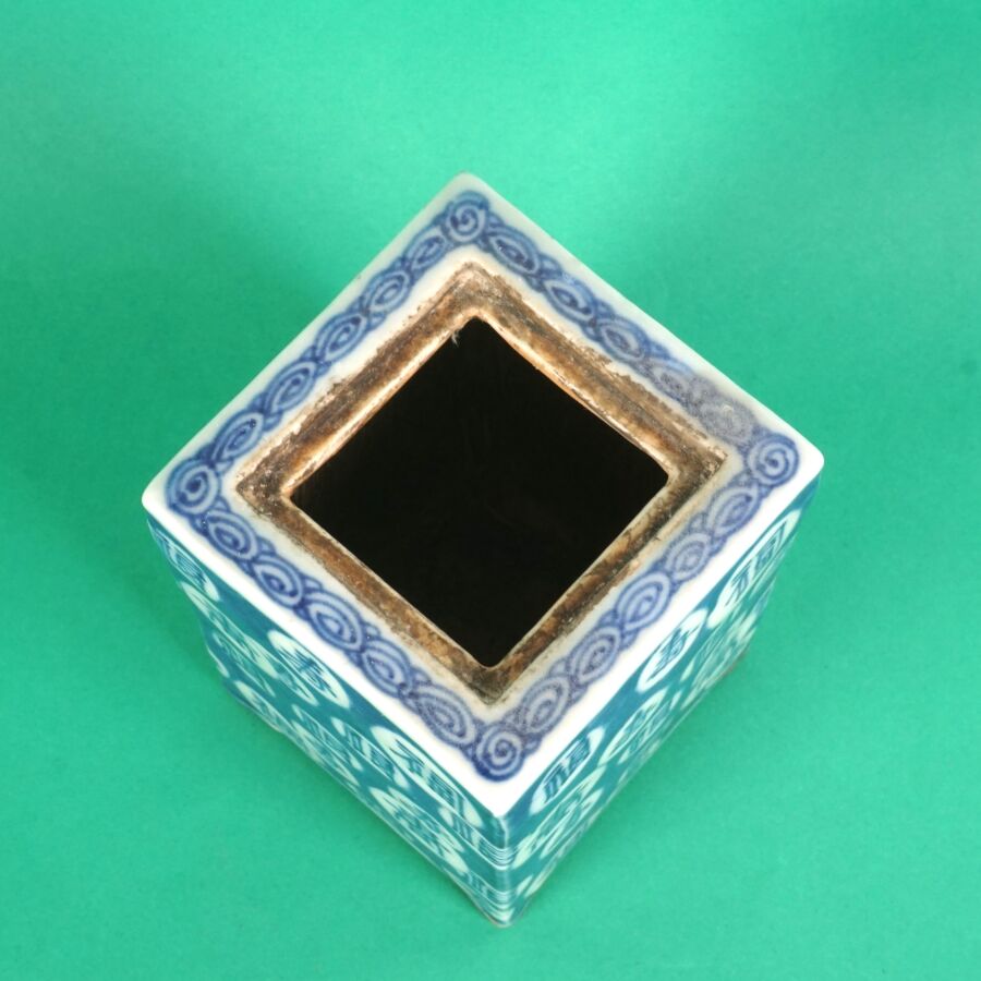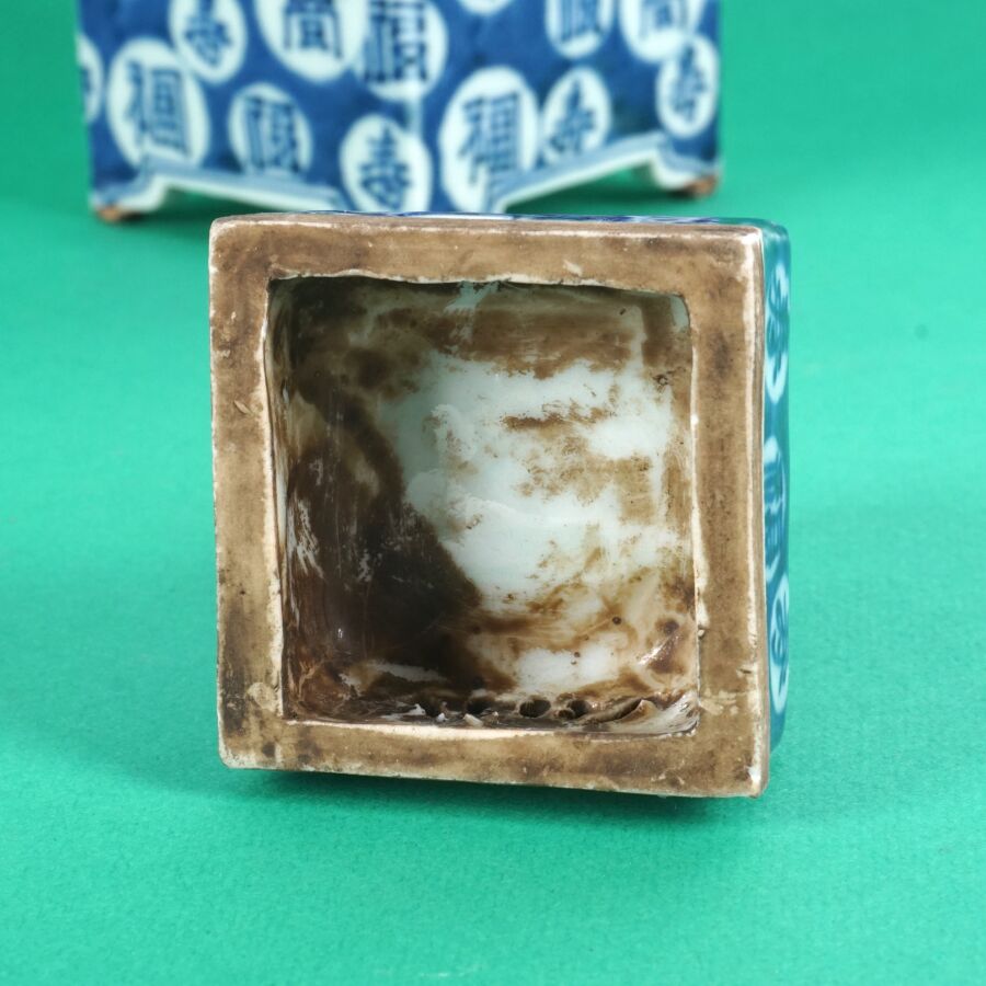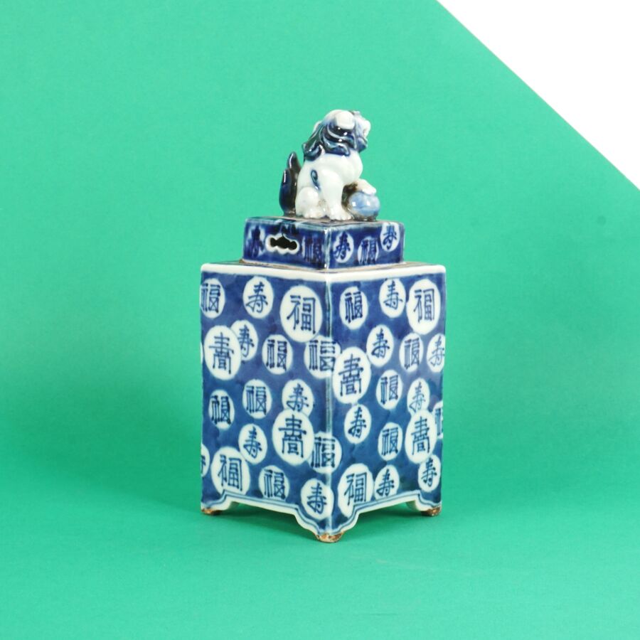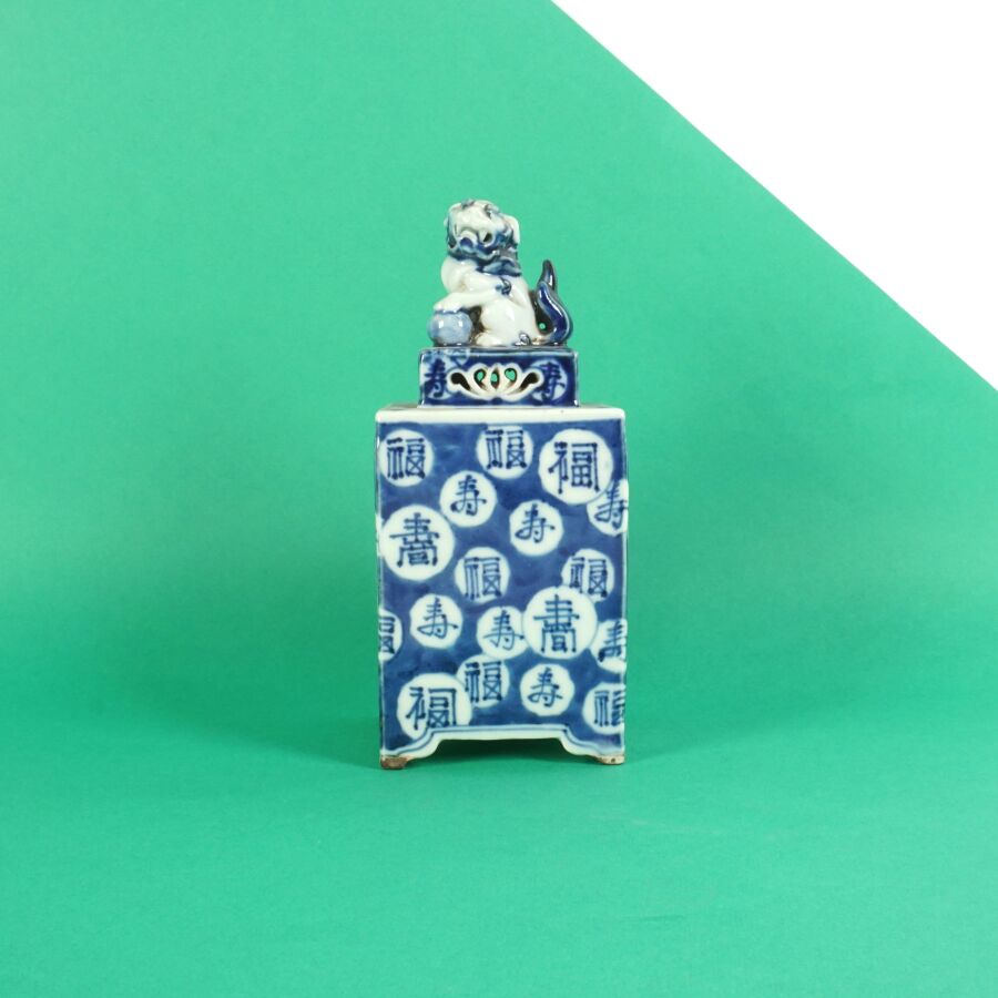 Brûle-parfum de forme quadrangulaire, en porcelaine bleu blanc, à décor de calligraphies en médaillons, la prise surmontée d'un shishi, calligraphies au revers Gorodaiyu go Shonzui (Nom Chinois " Wu Xiangrui "), Japon, 19ème siècle H. 16,5 x 6.9 x 6.9 cm.