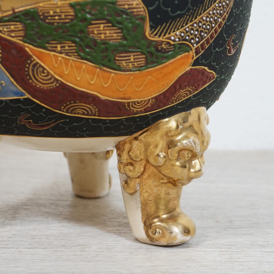 Brûle-parfum en porcelaine émaillée et rehaussée à l'or à décor de guerriers et orné sur le couvercle de chiens de Fô, Satuzma, Japon, H. 34 cm (petites usures à la dorure).