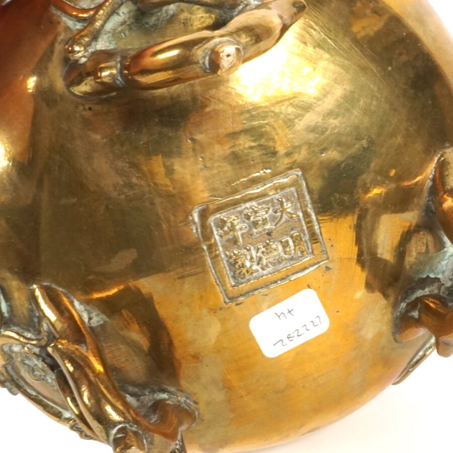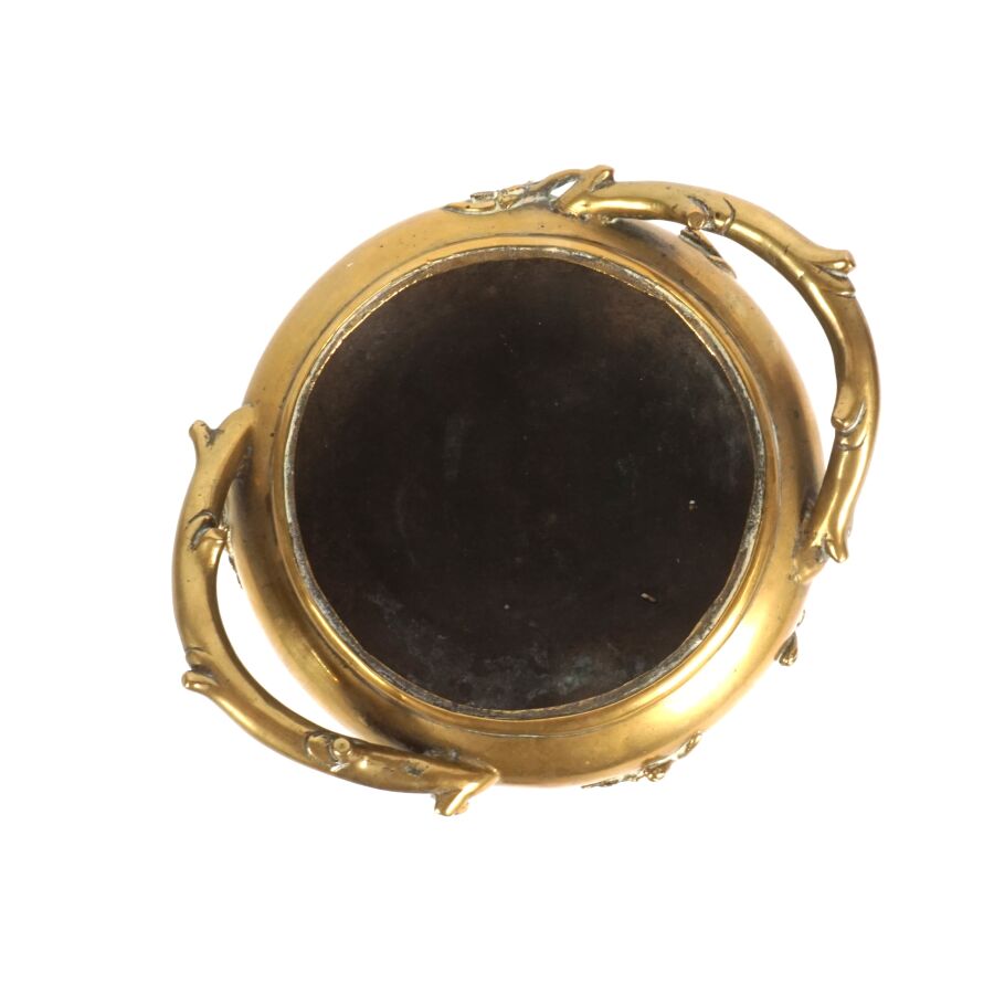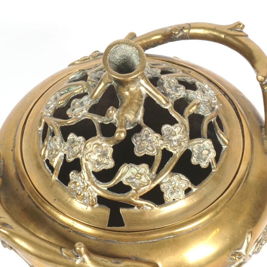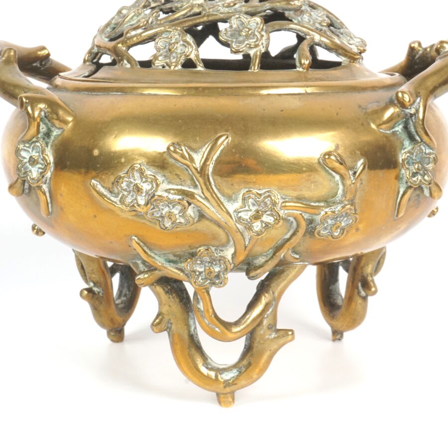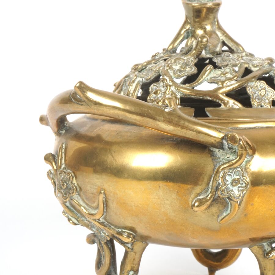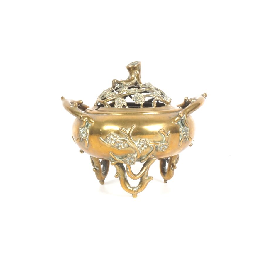 Brûle-parfum tripode en bronze à patine dorée, le couvercle à décor ajouré de fleurs de prunus, les anses en forme de branches de prunus en fleurs, Indochine circa 1920, H. 20.5 cm (dépatiné, sans son socle).