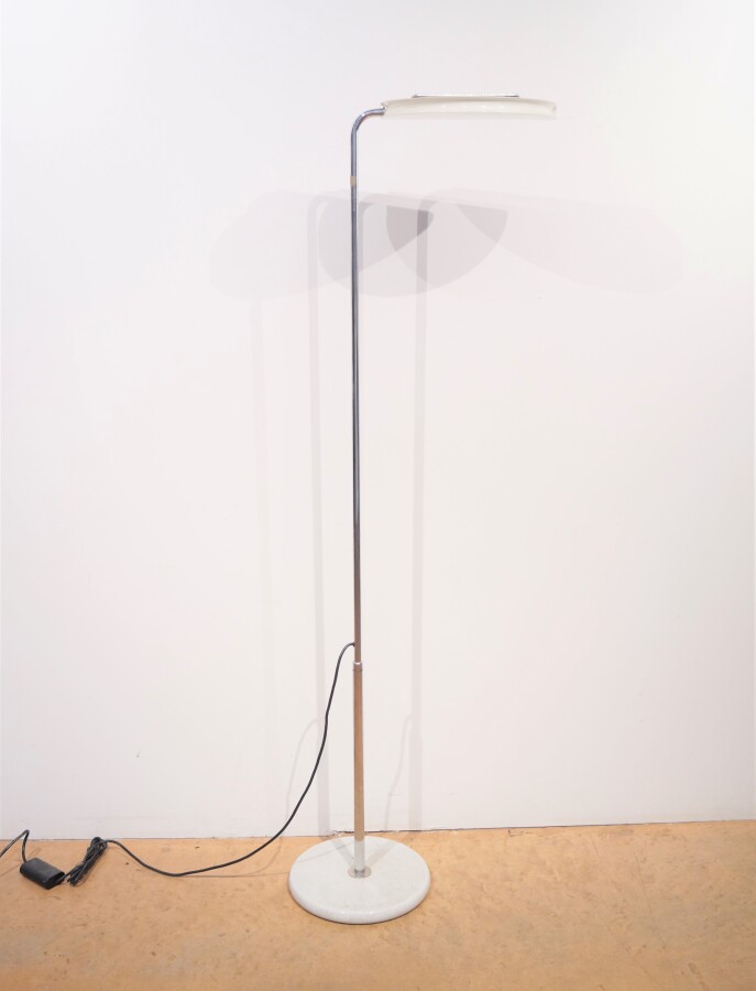 Bruno GECCHELIN (1939) : Lampadaire modèle "Mezzaluna", le diffuseur orientable en métal laqué blanc, monté sur une tige télescopique en aluminium reposant sur une base circulaire en marbre blanc veiné, H. 178 cm.