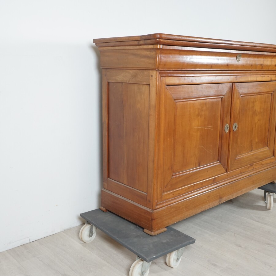 Buffet bas, bois naturel, ouvrant à un tiroir en partie haute et à deux vantaux en partie basse, plateau à doucines, H. 96.5 x 139.5 x 47.5 cm (vantaux à refixer, usures, traces, avec une clé non fonctionnelle).