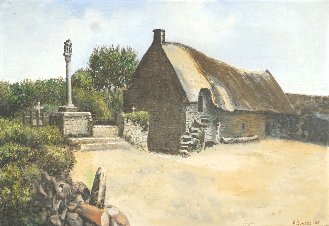 BUKOWSKI (XXe), "Chaumière bretonne près d'un calvaire" 1963, huile sur toile, signée et datée en bas à droite 49 x 71 cm.