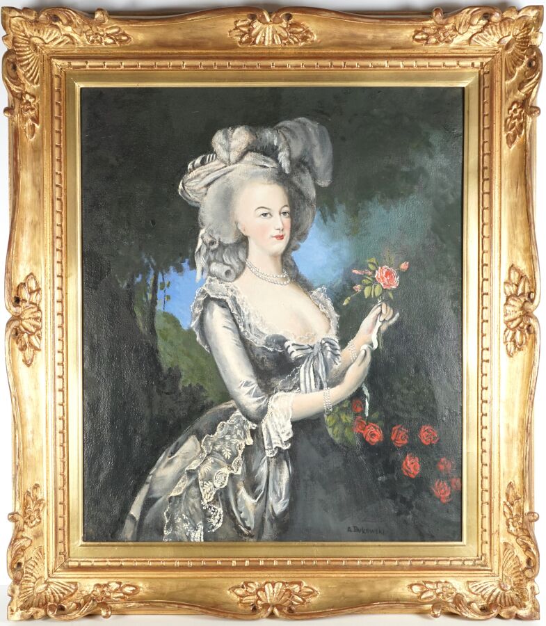 BUKOWSKI (XXe), "Portrait de Marie-Antoinette à la rose", huile sur toile, signée en bas à droite, 63 x 52 cm.