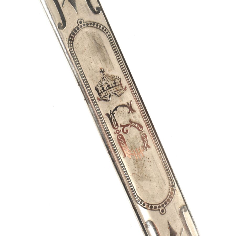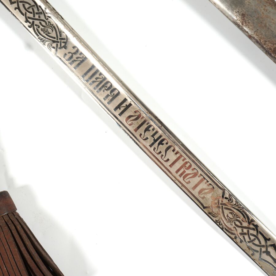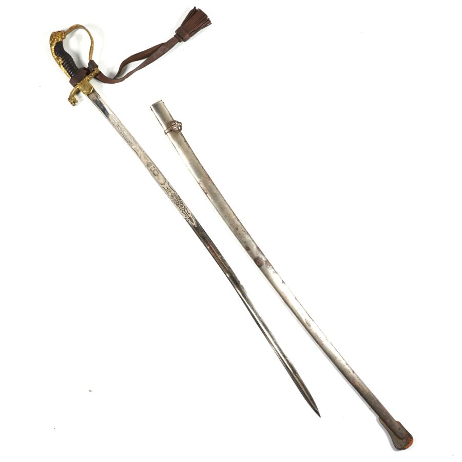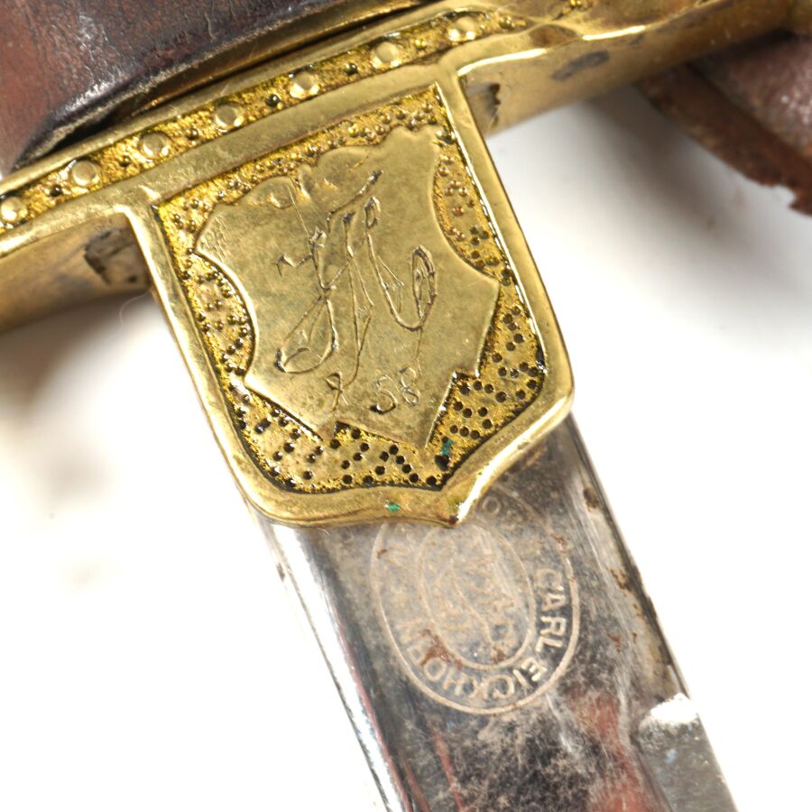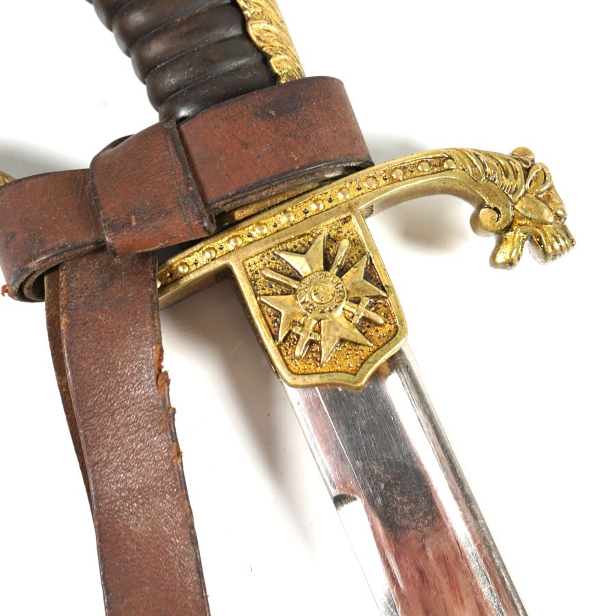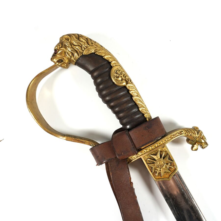 BULGARIE - SABRE D'OFFICIER, monture ciselée en laiton doré à une branche plate, poignée cannelée sans filigrane, croisière chiffrée, quillon recourbé en forme de tête de lion, pommeau en forme de tête de lion aux yeux en verre rouge, Lame nickelée de 86 cm à dos rond, gravée au chiffre du roi Boris III et devise " Pour le roi et la patrie " de l'autre côté, marque au talon du logo de la maison Karl Eickhorn, fourreau nickelé piqué à un bracelet et anneau de suspente, dragonne en cuir marron, BE.