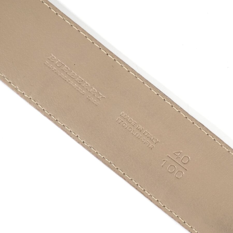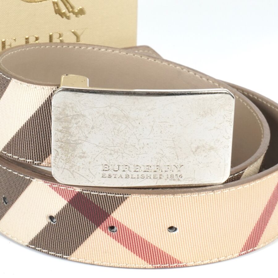 BURBERRY : Ceinture en cuir beige à motif dit tartan, boucle en métal argenté logoté, signée et numérotée, présentée dans sa boîte d'origine, Larg. 3.5 cm. L. Totale : 105 cm (petites traces et rayures à la boucle).