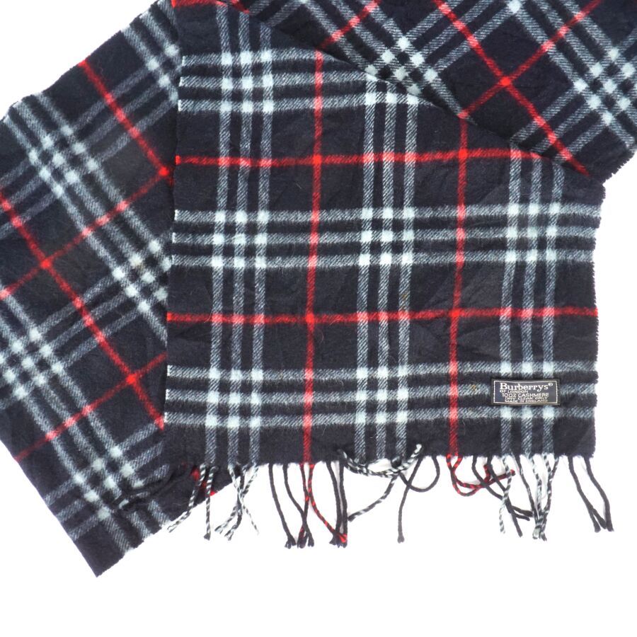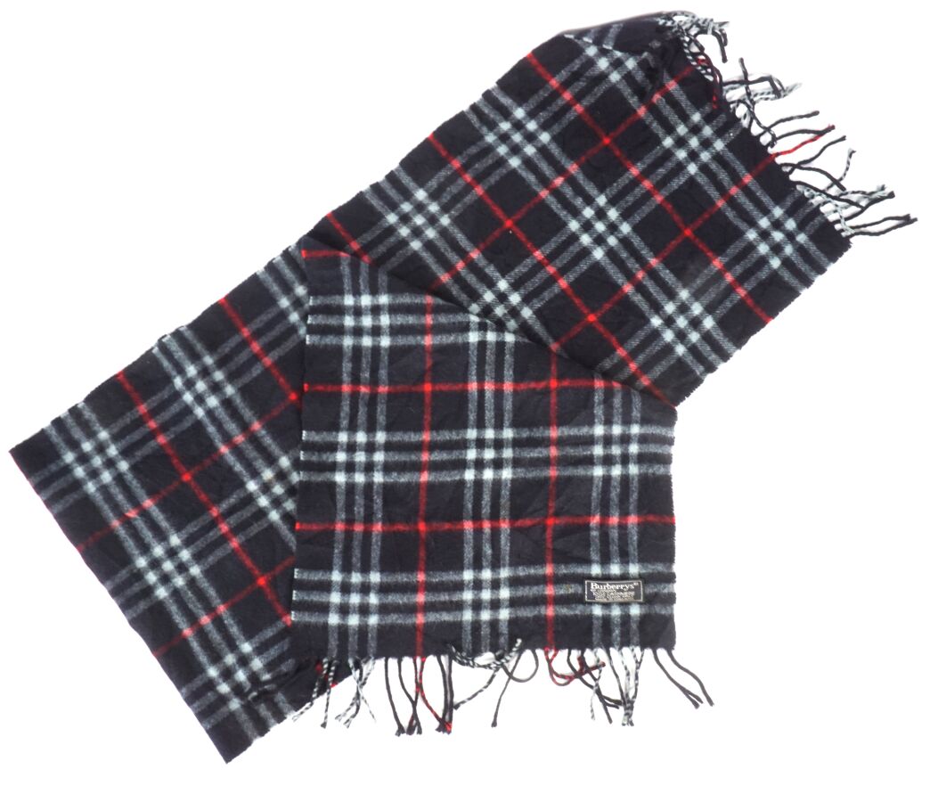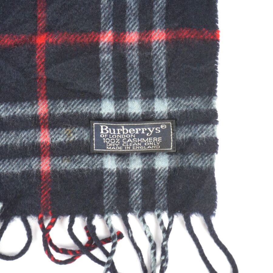 BURBERRY'S : Écharpe en cachemire à motif dit tartan gris et rouge sur fond bleu nuit, avec son étiquette, Dim. 130 x 30 cm.