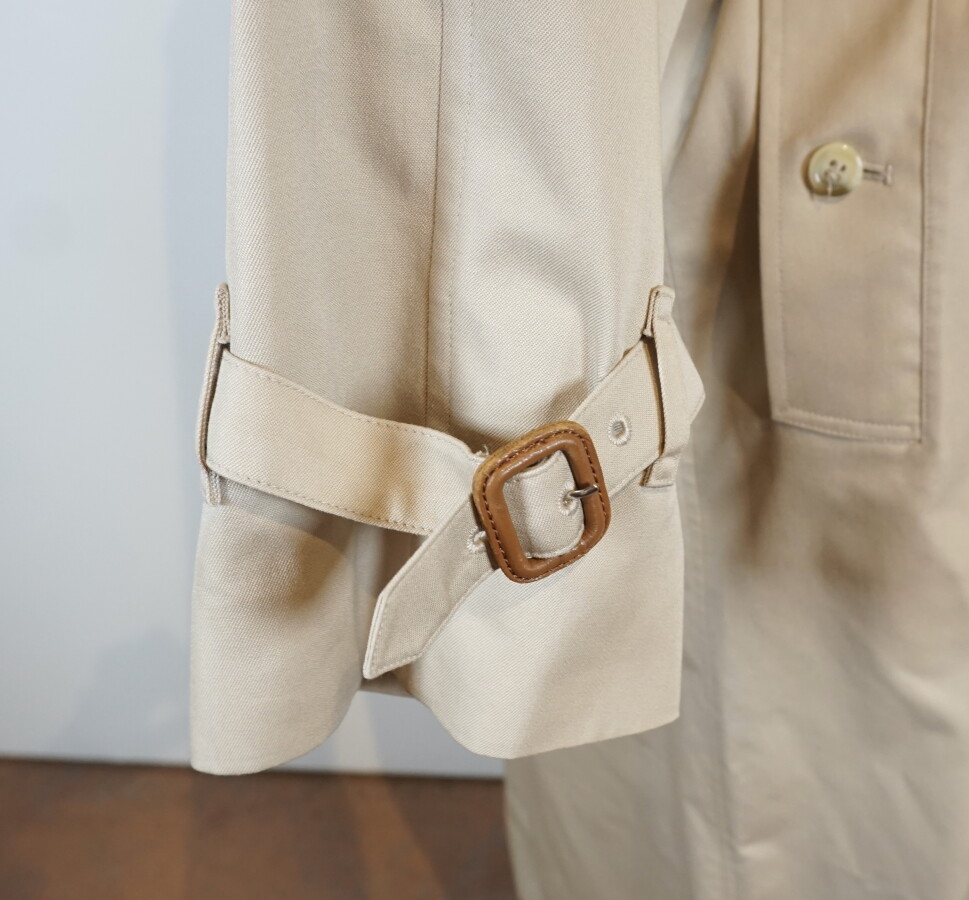 BURBERRY'S : Trench croisé en coton beige, avec sa ceinture, doublure en tissu "check", T. 38/40 environ (infimes petites taches, le bouton à l'arrière manquant, sinon bel état général).