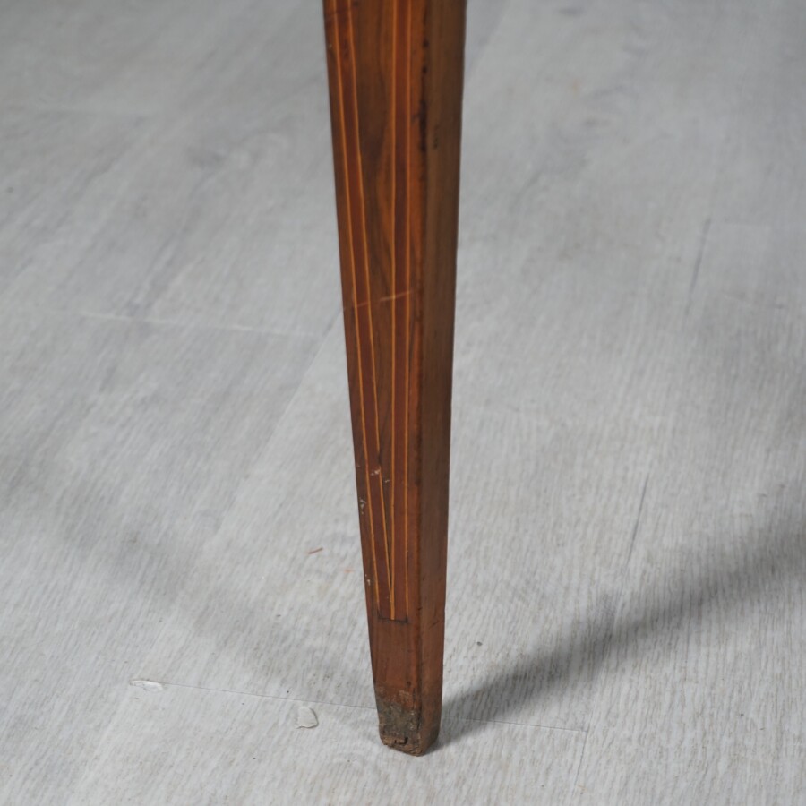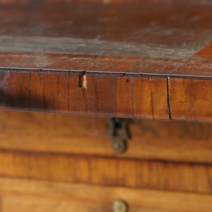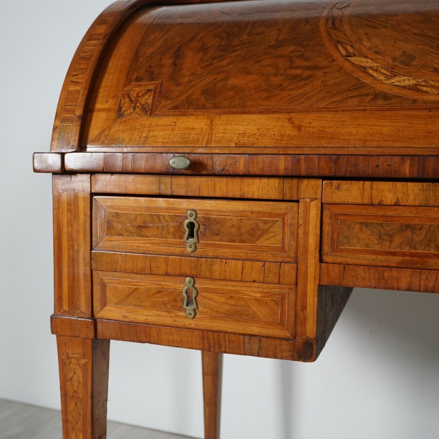 Bureau à cylindre de style Louis XVI en bois de placage, à décor marqueté de feuilles, frises feuillagées stylisées, filets et motifs géométriques, le cylindre à mouvement se relevant en tirant le plateau gainé de cuir vert estampé au petit fer et découvrant trois tiroirs, la ceinture ouvrant à 5 petits tiroirs, il repose sur quatre pieds gaines, début du 19e siècle, H. 103 cm, L. 97.5 cm, P. 62.5 cm (sans clé, quelques sauts au placage, petits accidents).