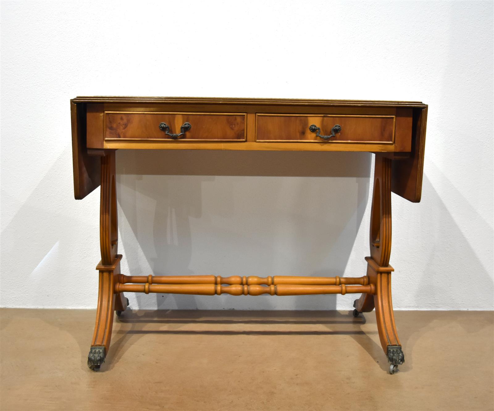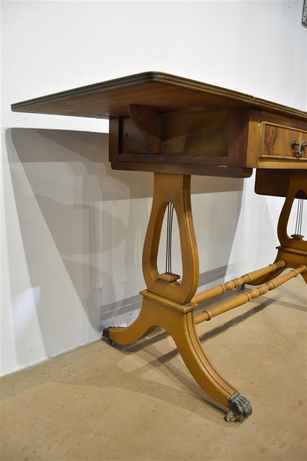 Bureau anglais à deux volets, ouvrant à quatre tiroirs sur deux faces, plateau garni d'un maroquin vert, piétement lyre finissant par des griffes, sur roulettes, 145 x 50 x H. 74 cm (griffures au plateau)