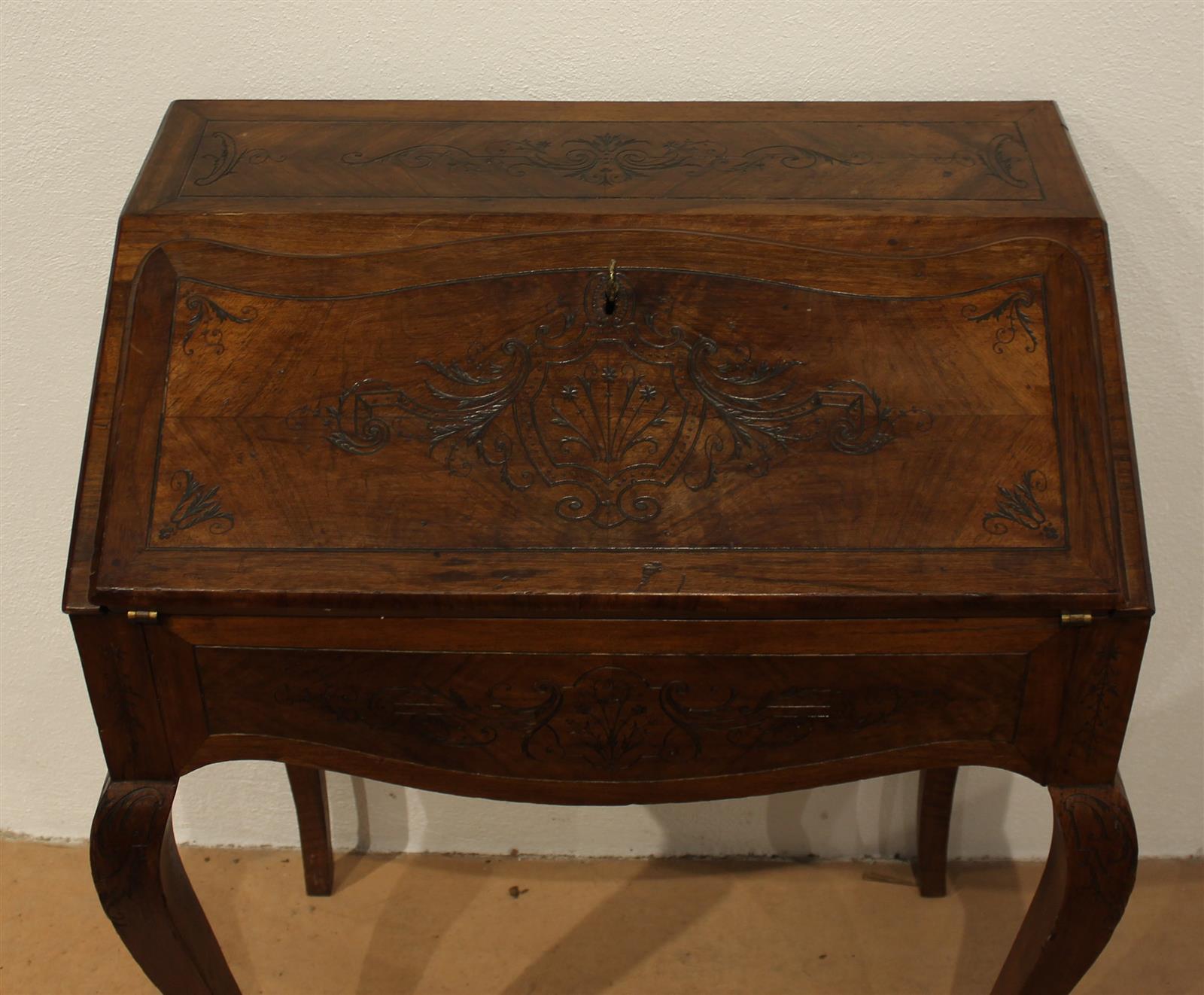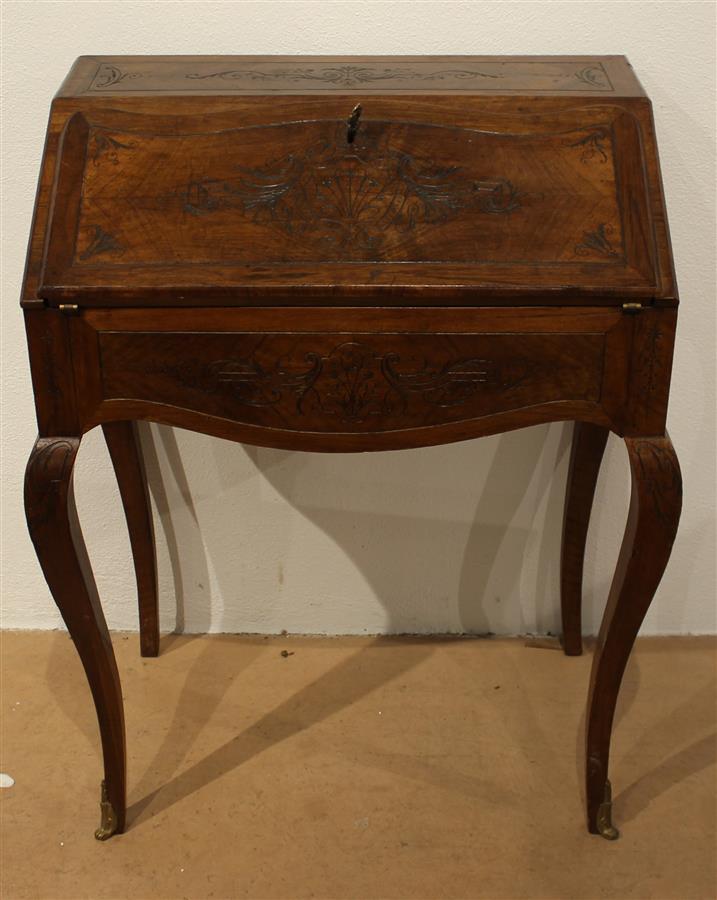 Bureau de pente style Louis XV, en noyer et placage de noyer, à décor de feuillages stylisés, piétement cambré terminé par des bronzes en chute, fin 19e-début 20e siècle, 66 x 41 x H. 88 cm (transformations)
