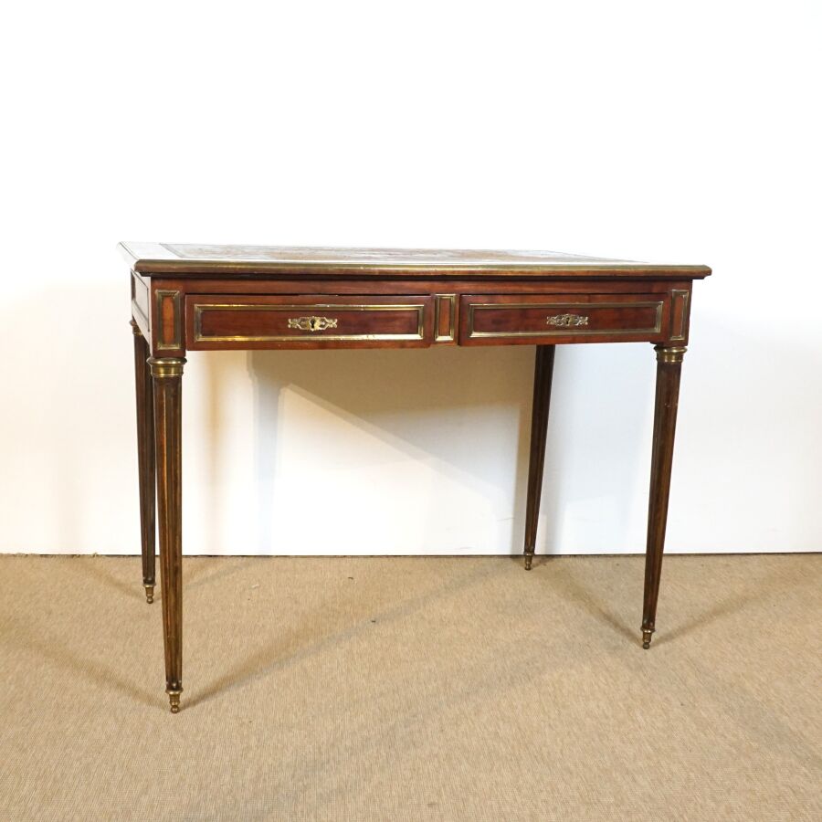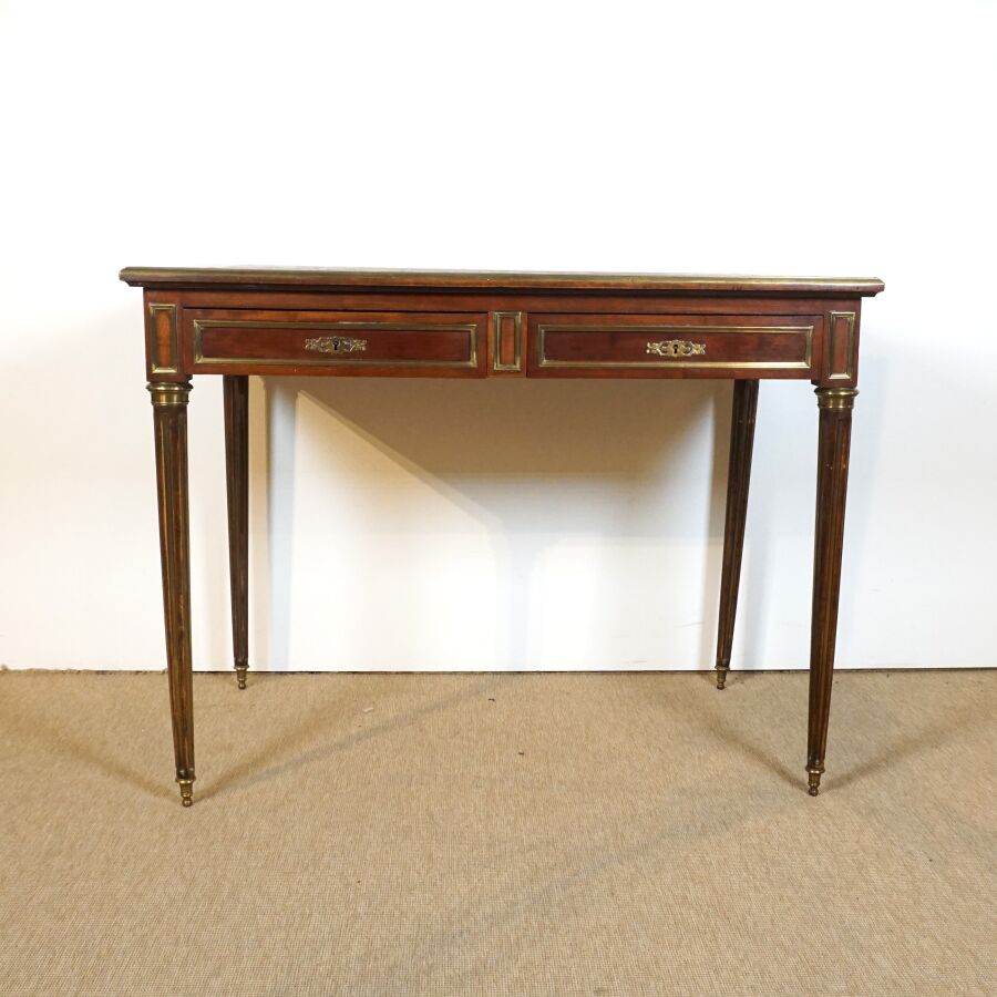 Bureau de style Mazarin en bois ouvrant à deux tiroirs, plateau gainé de cuir noir, piètement fuselé cannelé, 19ème siècle, 76 x 100.5 x 60 cm (avec sa clé, usures, sauts).