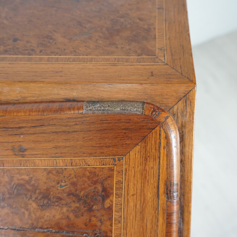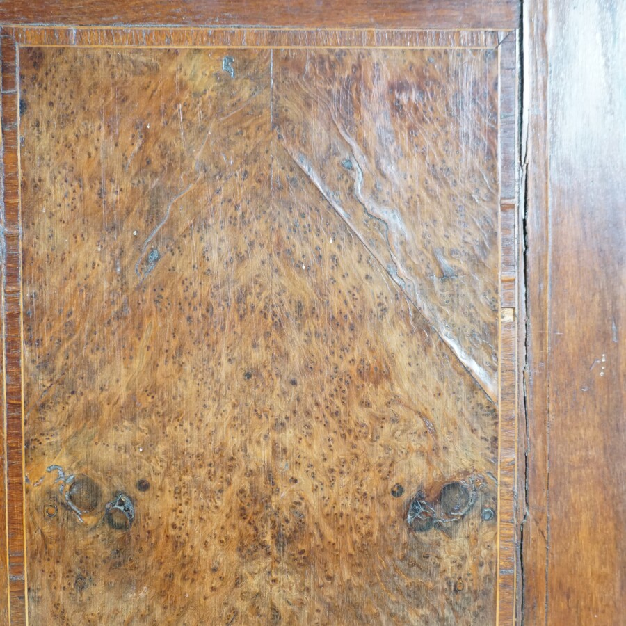 Bureau dos d'âne de style Louis XV, en bois de placage et placage de loupe de noyer, à décor marqueté toutes faces d'une importante coquille et de filets, ouvrant à un abattant découvrant un plateau gainé d'un cuir havane, tiroirs, gradins et casiers, la ceinture chantournée ouvrant à 3 tiroirs sur 2 rangs, il repose sur quatre pieds hauts légèrement cambrés, ornementation de bronzes ciselés et dorés telle que poignées de tirage, entrées de serrures et sabots, travail régional du 19e siècle, 97.5 x 49 x H. 98 cm (avec 3 clés, quelques manques et sauts au placage, bronzes rapportés, bronze à refixer).