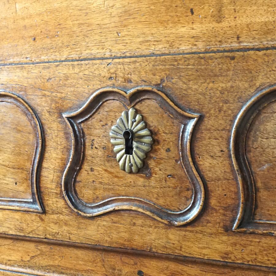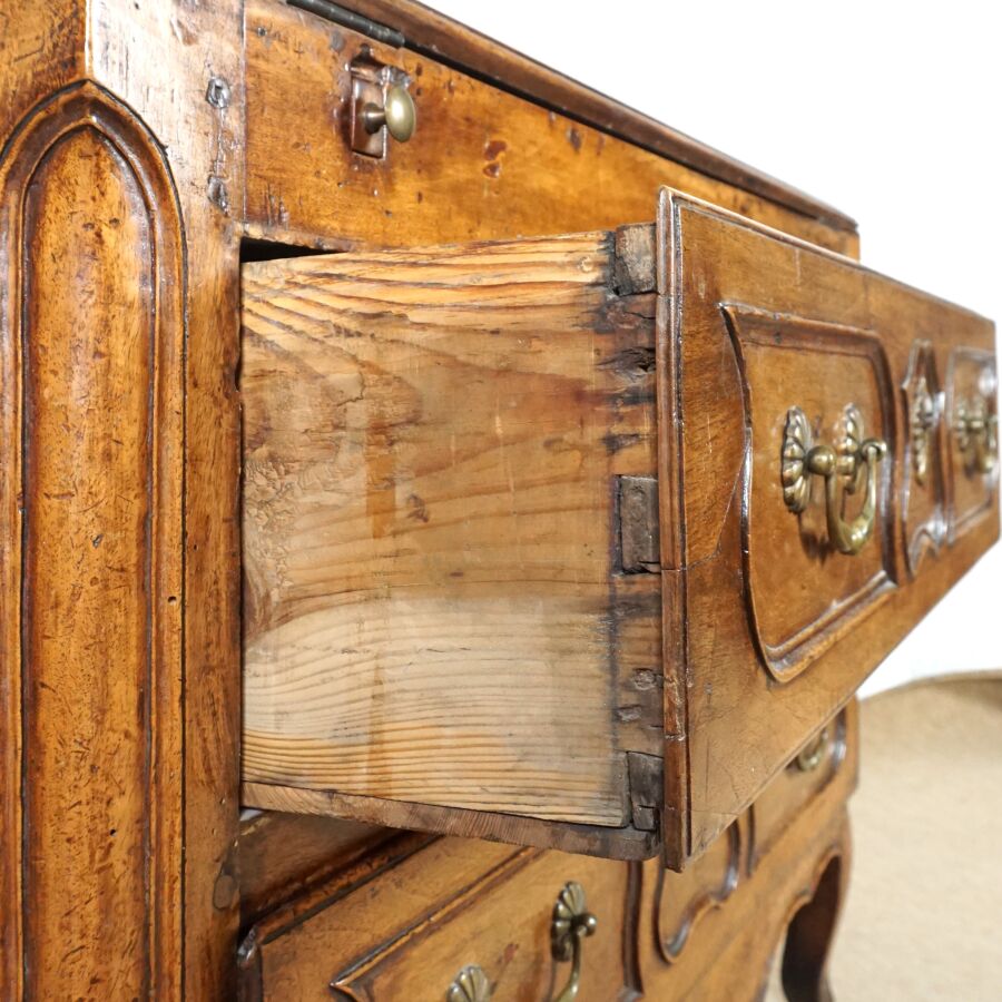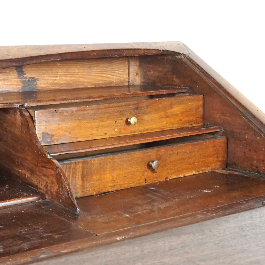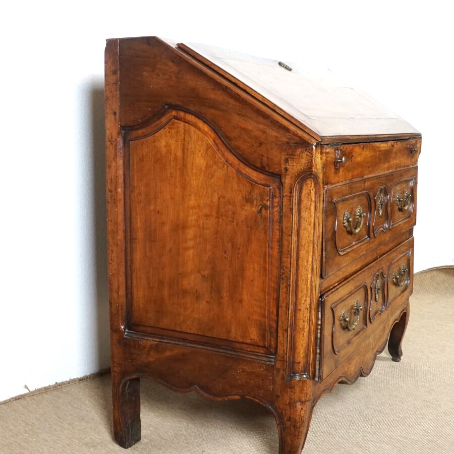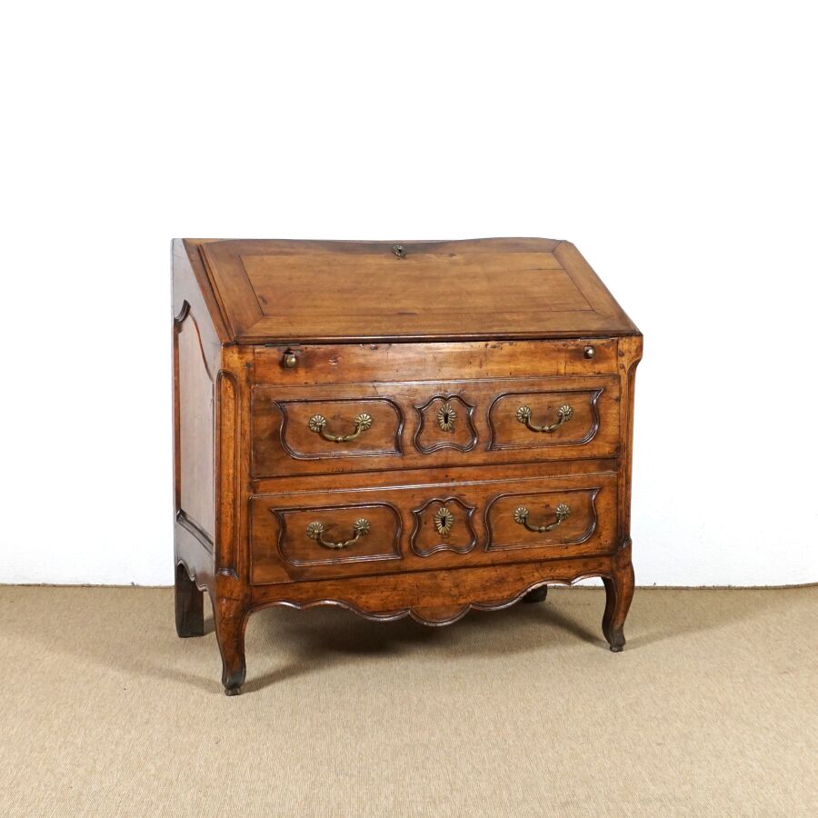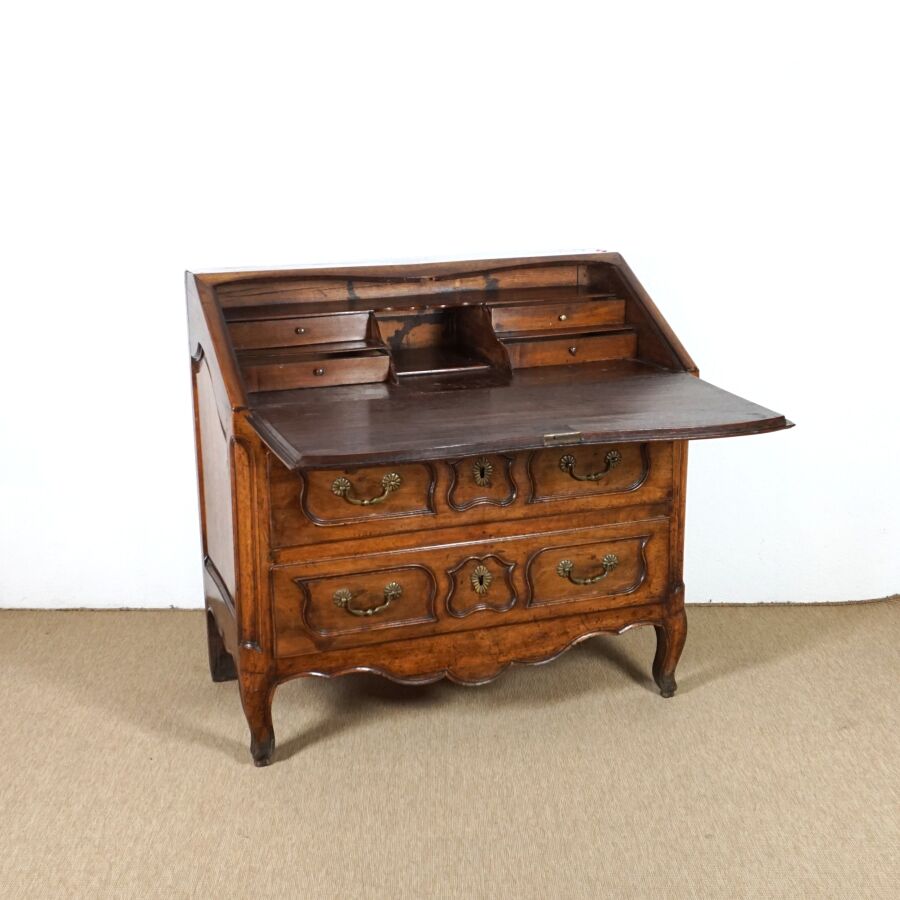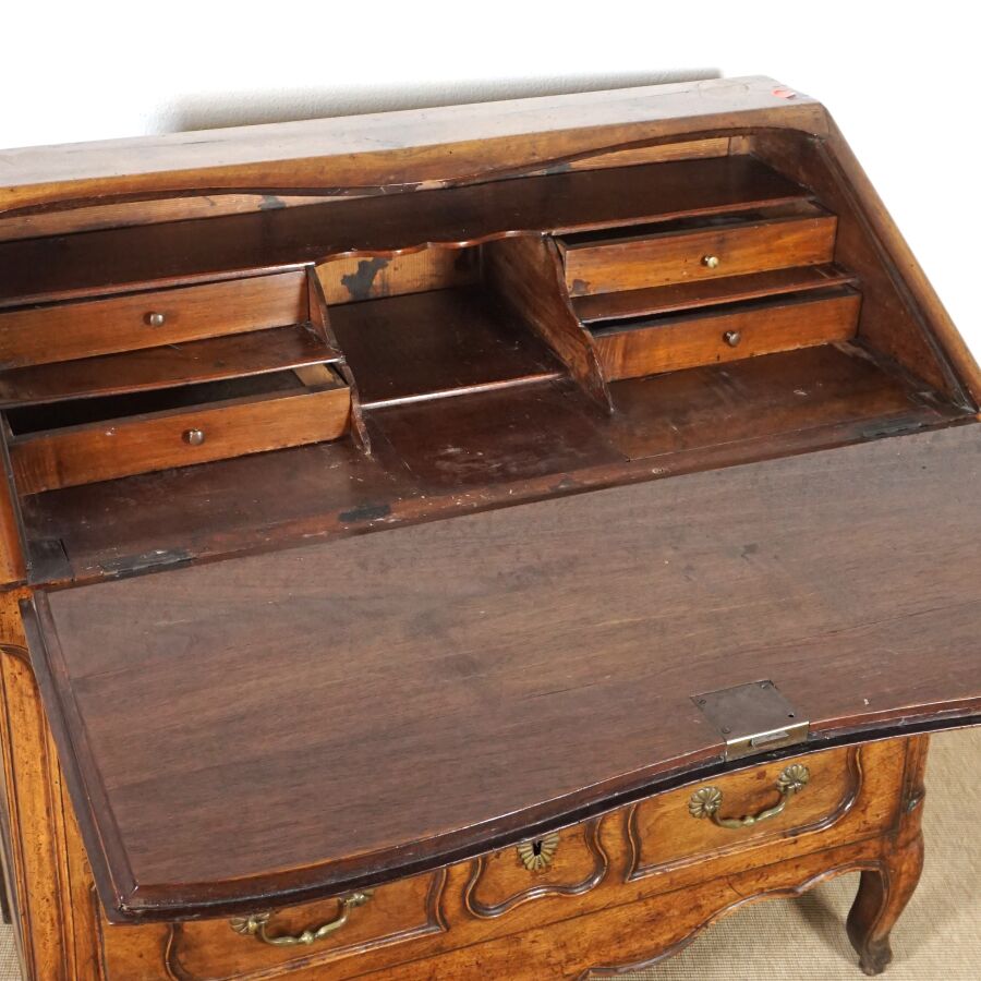 Bureau scriban en bois mouluré, ouvrant à un abattant reposant sur deux tirettes formant support et découvrant tiroirs et trappes, ouvrant en partie basse à deux tiroirs, ornementation de métal doré à motif de fleurettes telle que poignées de tirage et entrées de serrure, piétement cambré, travail régional de la fin du 18ème siècle, Dim. 92 x 95 x 47.5 cm (avec clé, usures et traces).