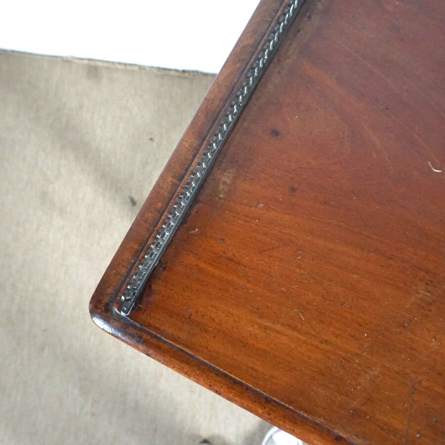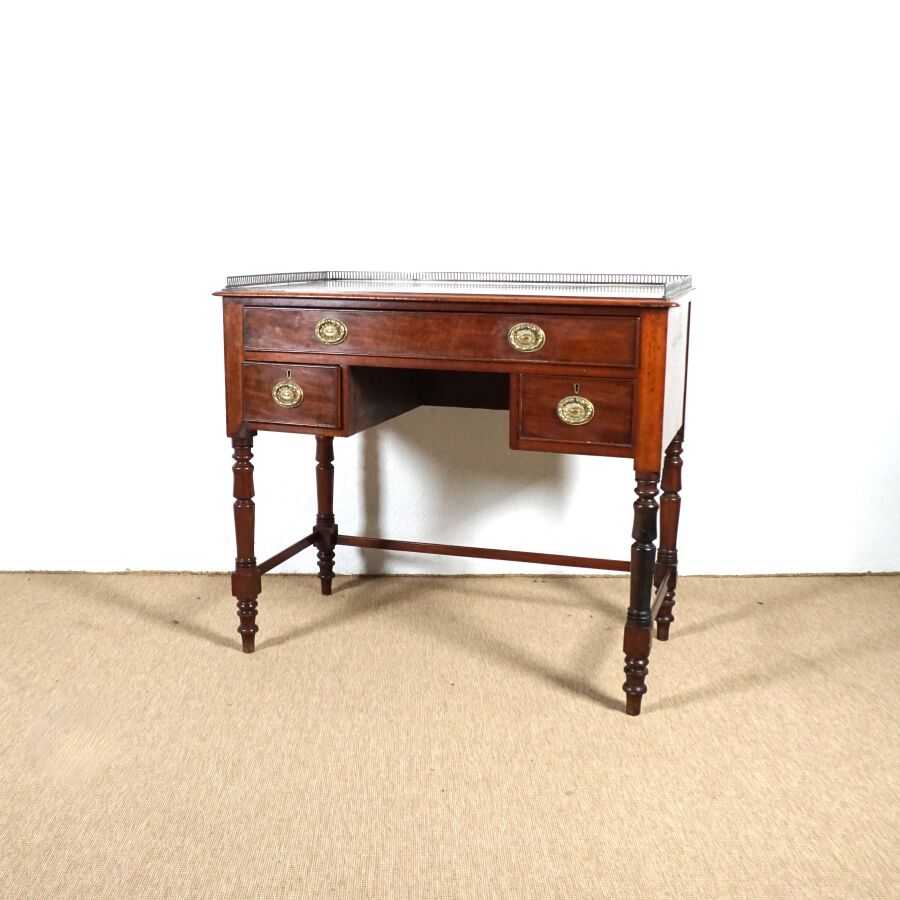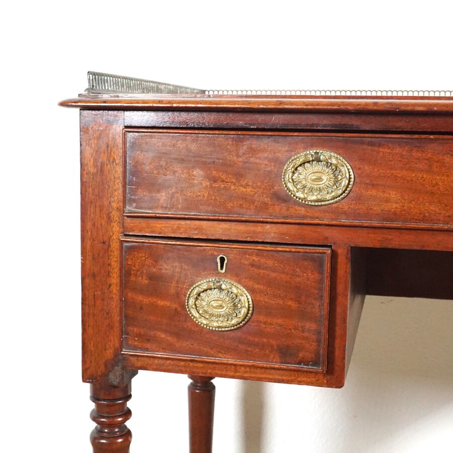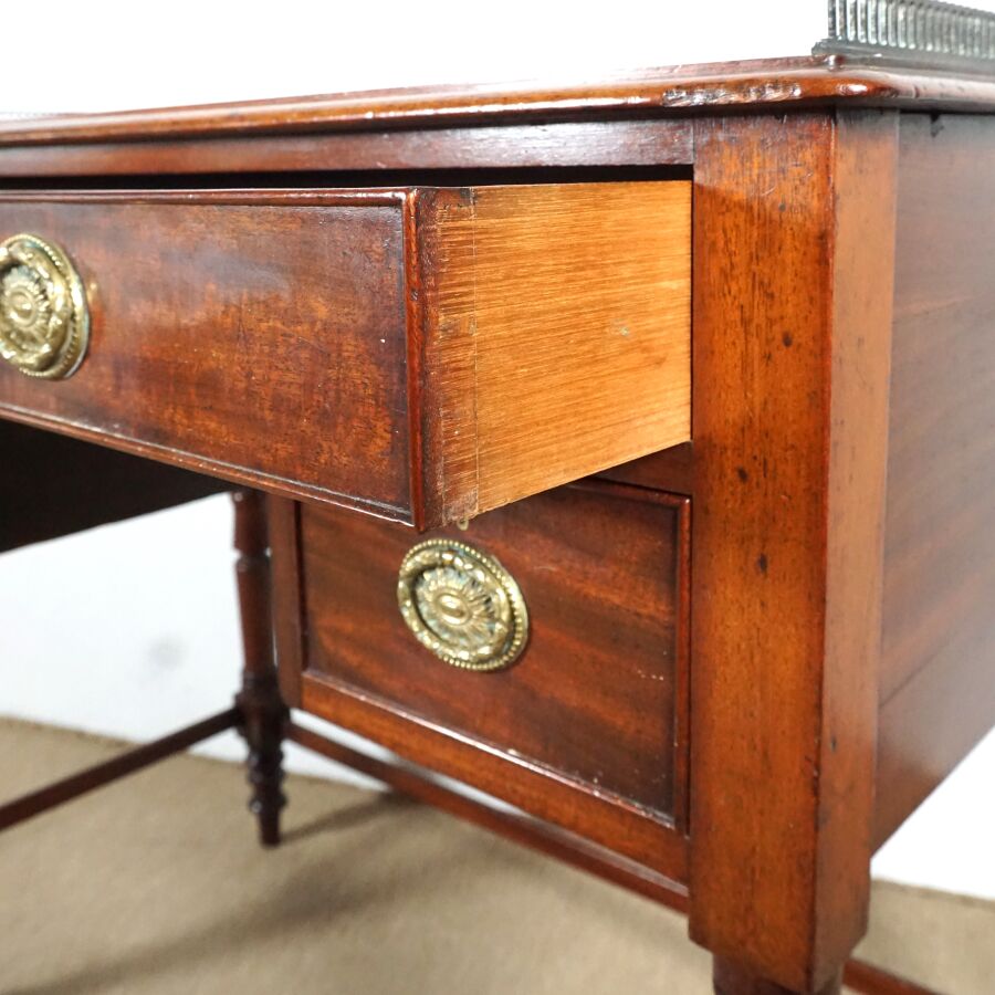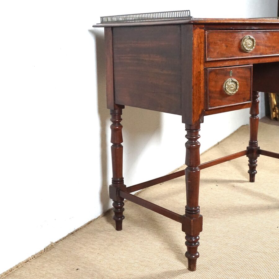 Bureau style Mazarin en bois ouvrant en ceinture à trois tiroirs dont deux latéraux, plateau rectangulaire serti d'une galerie en laiton ajouré, ornementation de métal telle que poignées de tirage à décor d'une couronne de laurier, piétement en bois tourné réuni par une entretoise en U, 19ème siècle, H. Totale (avec galerie) : 80 x 91.2 x 49.3 cm (usures, petites traces, sans clé).
