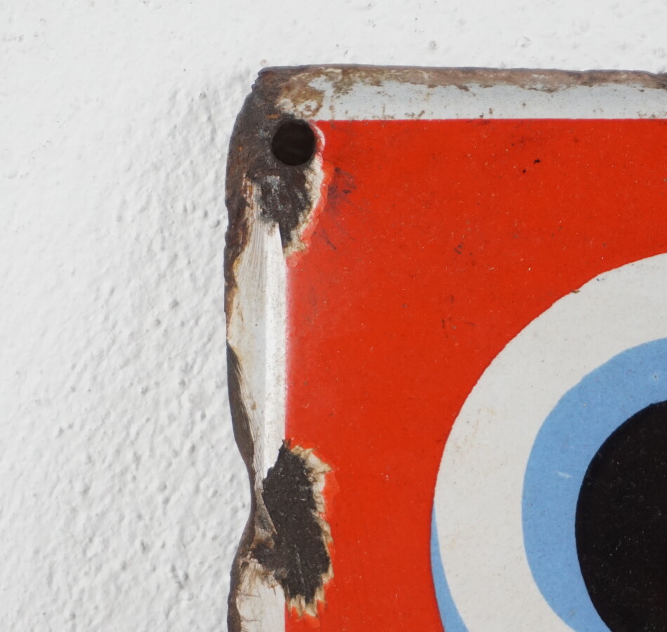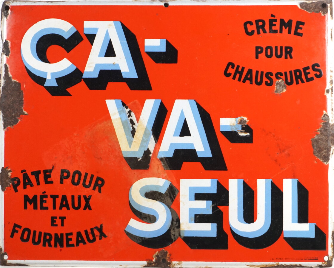 CA VA SEUL : Plaque en tôle émaillée à 6 trous de fixation "ça va seul, crème pour chaussures, pâte pour métaux et fourneaux", émailKoekelgerg, Bruxelles, 39.4 x 49 cm (écaillures, manques, traces).
