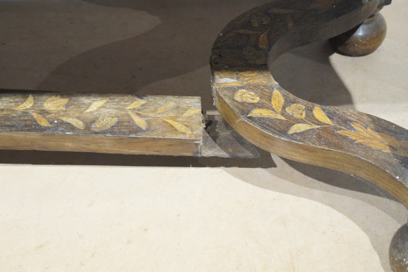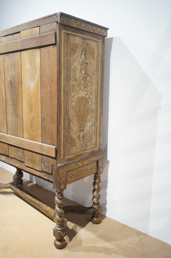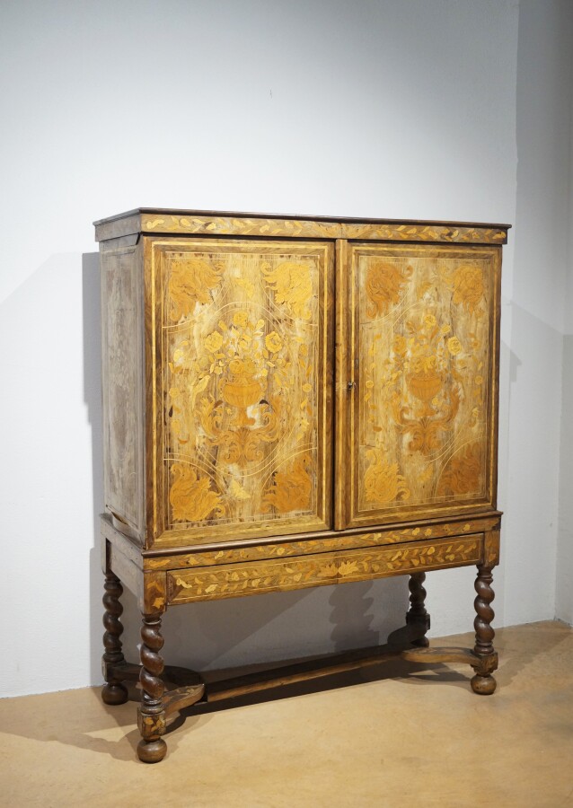 Cabinet en bois de placage ouvrant à 2 vantaux à décor marqueté de vases fleuris, découvre 2 étagères et 4 petits tiroirs, un grand tiroir en ceinture, piétement torsadé relié par une entretoise en H, 127 x 50 x H. 165.5 cm (placage en l'état, insolé, déverni, accident à l'entretoise, avec une clé).