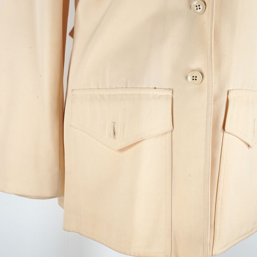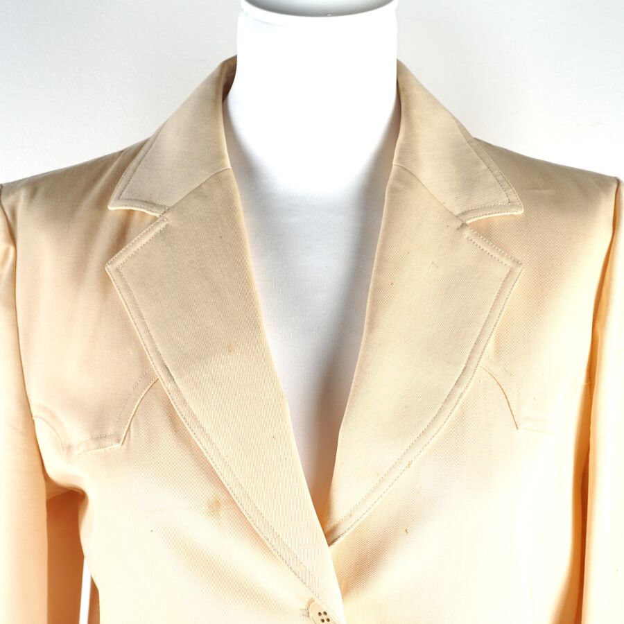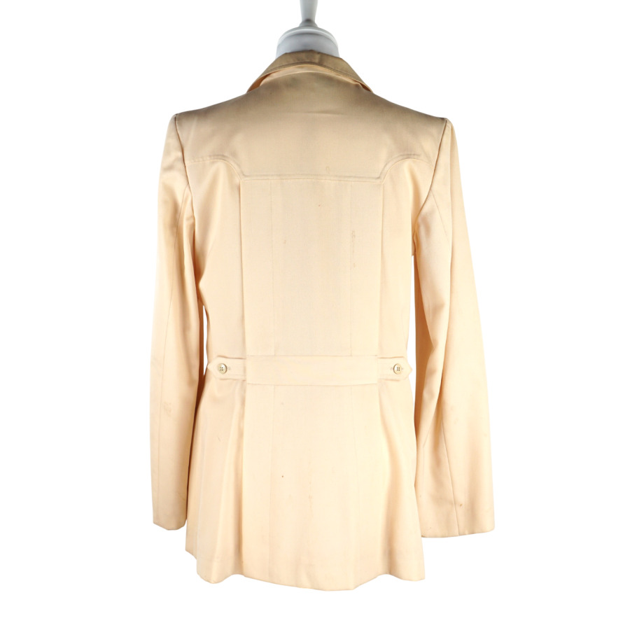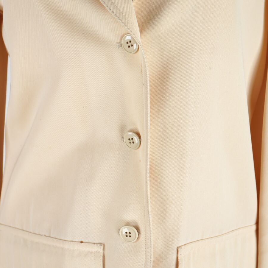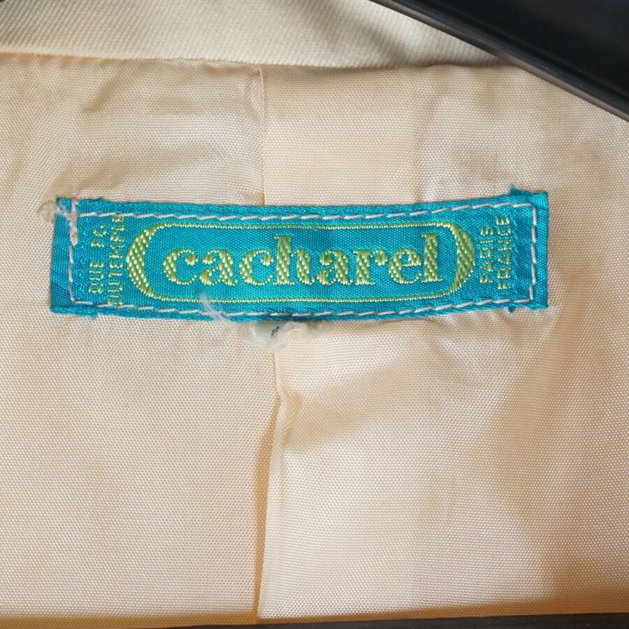 CACHAREL : Veste blazer en laine de couleur beige - rose poudré, col dit tailleur, fermeture à l'avant par trois boutons, deux poches latérales fermant par un bouton, manches longues, doublure en acétate, taille indiquée 44, étiquette intérieure, L. Totale : 74.5 cm (taches, usures).