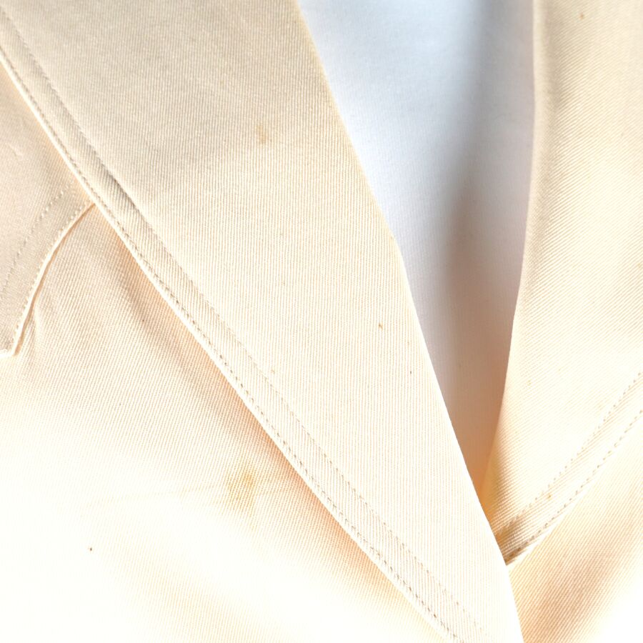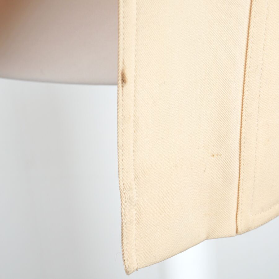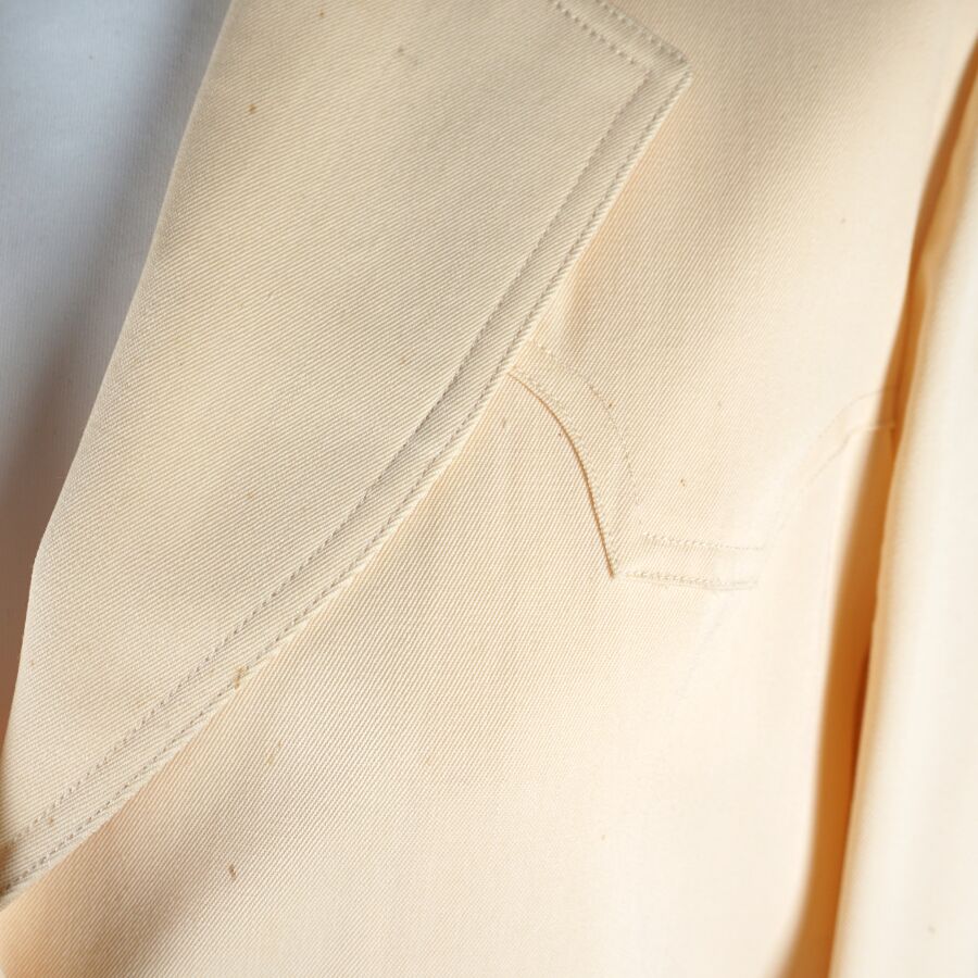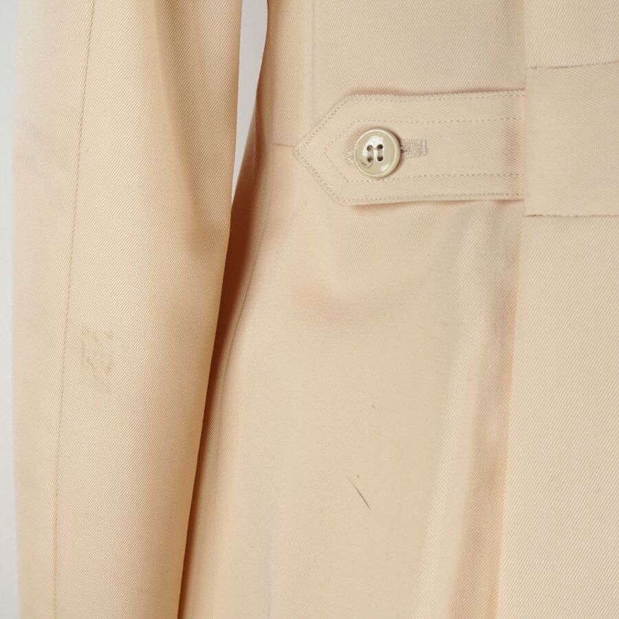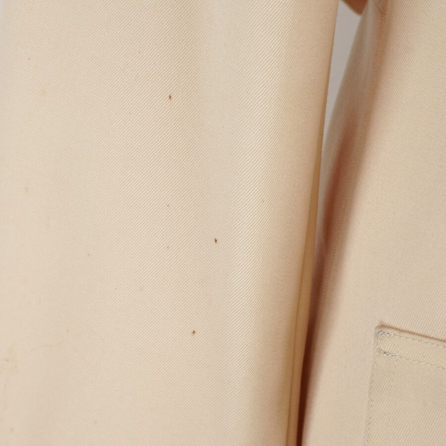 CACHAREL : Veste blazer en laine de couleur beige - rose poudré, col dit tailleur, fermeture à l'avant par trois boutons, deux poches latérales fermant par un bouton, manches longues, doublure en acétate, taille indiquée 44, étiquette intérieure, L. Totale : 74.5 cm (taches, usures).