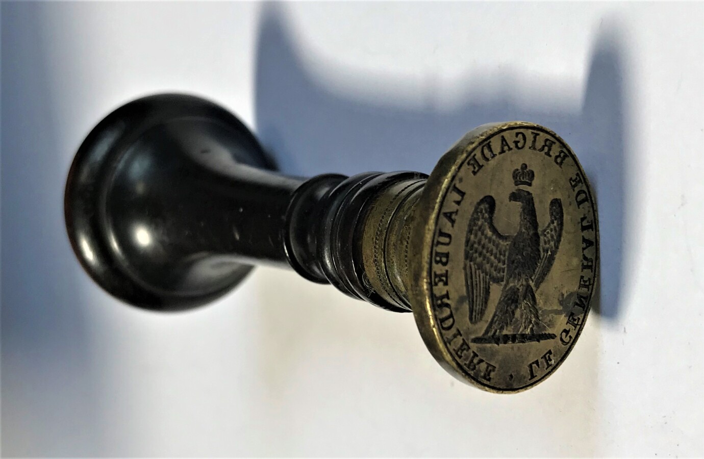 CACHET A CIRE DU GENERAL DE BRIGADE LAUBERDIERE, en laiton et de forme ovale, 28 x 24 mm, motif central à l'aigle tête laurée et aux ailes déployées avec la légende sur le pourtour " GENERAL DE BRIGADE LAUBERDIERE ", manche en bois noirci, hauteur : 9,5 cm, Premier Empire, TBE.