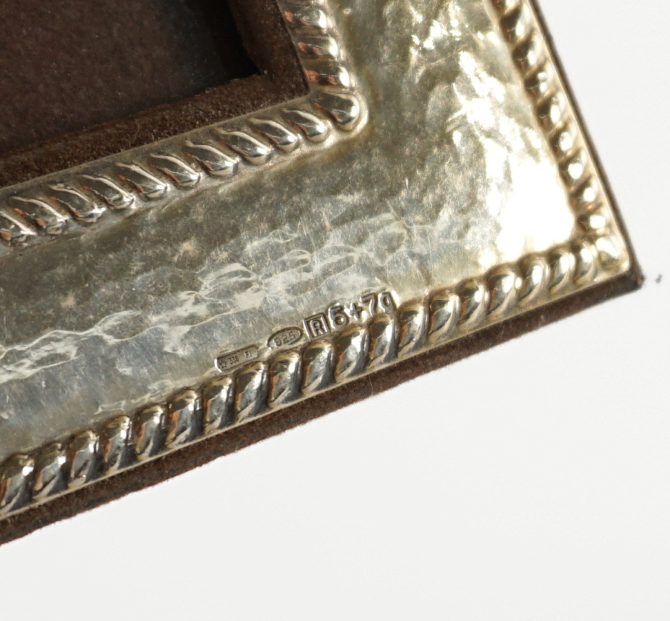 Cadre rectangulaire à poser en argent (925/oo) à décor martelé et de frises torsadées, 14 x 18 cm, pour une photo de 8.5 x 13 cm.
