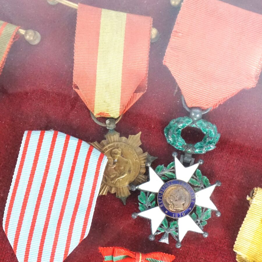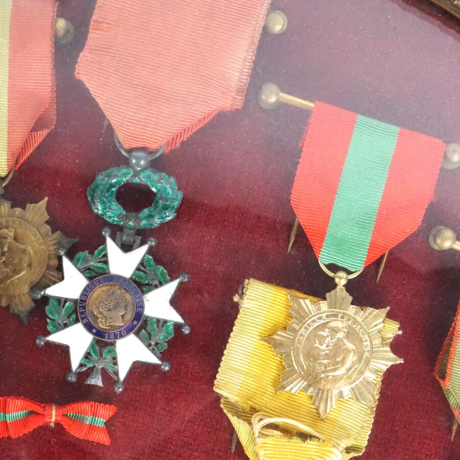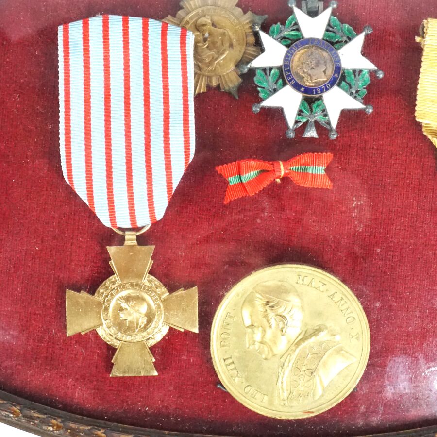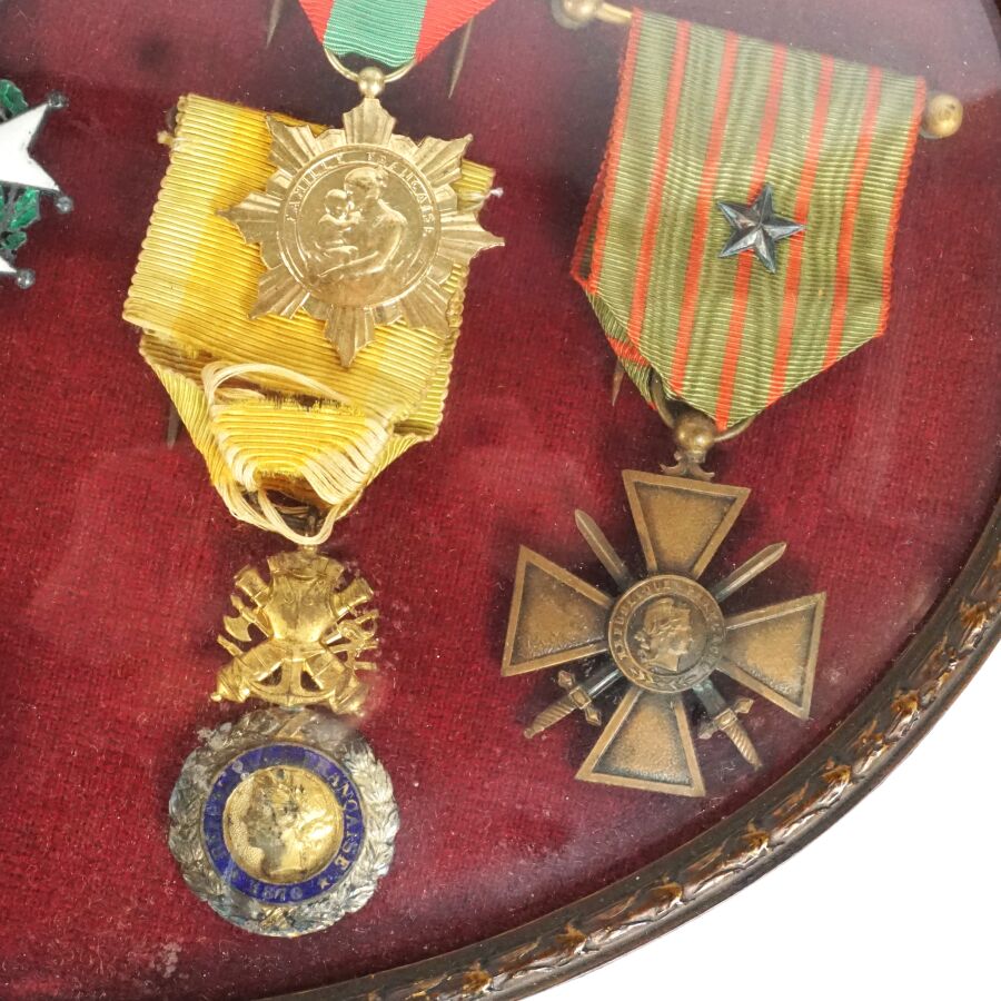CADRE RENFERMANT 7 DECORATIONS et une MEDAILLE DE TABLE : ORDRE DE LA LEGION D'HONNEUR (fondé en 1802) - III REPUBLIQUE (1852-1870) - ETOILE DE CHEVALIER, en argent ciselé et émail, MEDAILLE MILITAIRE III REPIBLIQUE, en argent, vermeil et émail, CROIX DE GUERRE 1914-191?, en bronze patiné, CROIX DU COMBATTANT (1930) en bronze doré, MEDAILLE DE LA FAMILLE FRANCAISE x 2 exemplaires, en bronze patiné et bronze doré, MEDAILLE DE TABLE LEON XIII, en bronze doré, cadre ovale en bronze patiné à décor de palmettes, verre bombé, 27 x 31 cm, BE.