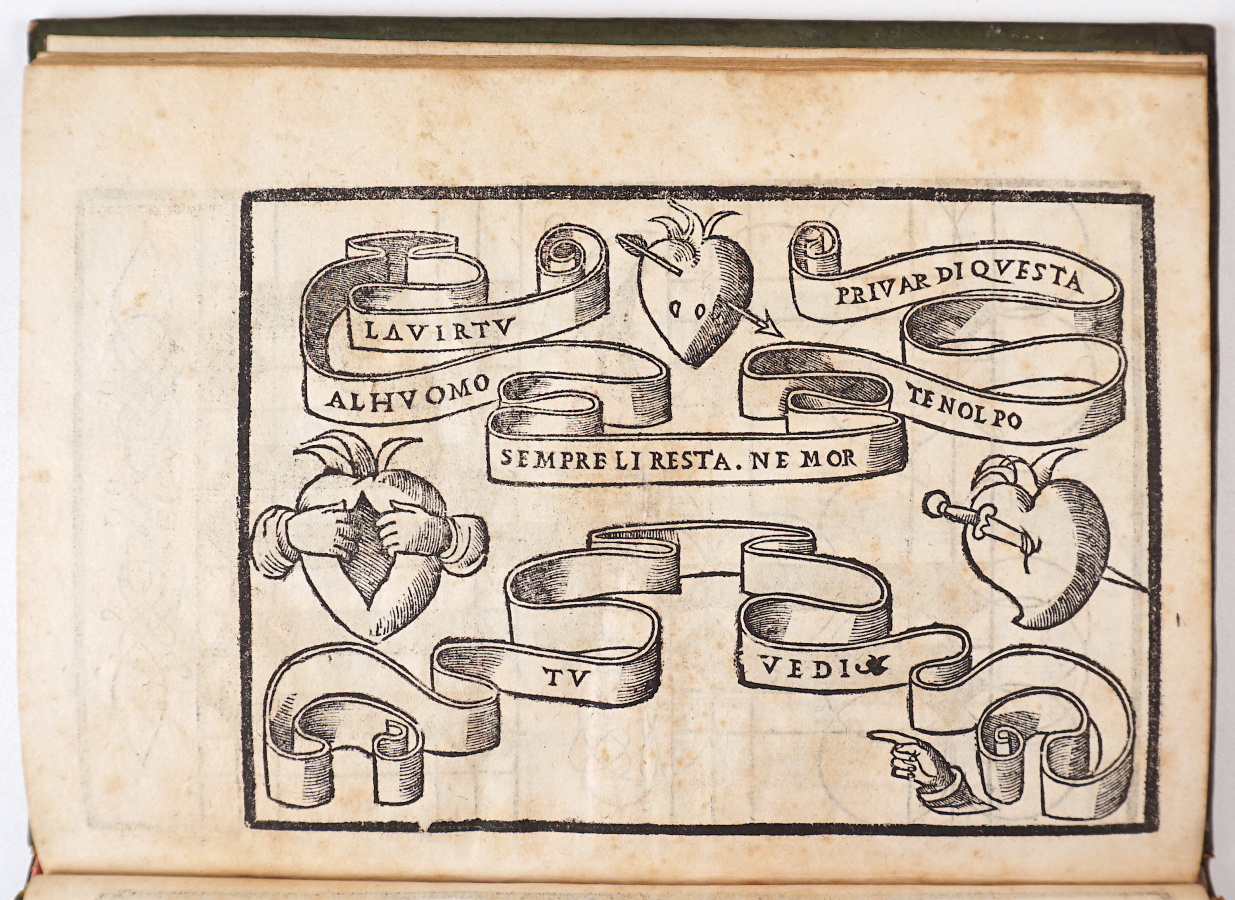 L'un des traités de calligraphie les plus importants du XVIème siècle. C'est sans doute sous l'influence de l'Operina du calligraphe et typographe Ludovica degli Arrighi (1480 ? - 1527 ?) que Tagliente publia son oeuvre regroupant différentes écritures cursives, ainsi que des alphabets variés en usage à l'époque. L'influence des modèles vénitiens et padouans se perçoit aussi dans son traité dont la première édition fut publiée en 1524. La vie de l'auteur nous est très peu connue, mais on sait qu'il fut maître d'écriture à la chancellerie de Venise. Son traité, qui fut un succès éditorial, fit de nombreux émules à travers plusieurs générations de scribes. Les figures sont reprises de celles gravées sur bois par Eustachio Celebrino (1480 ? - 155 ?) pour les éditions antérieures.