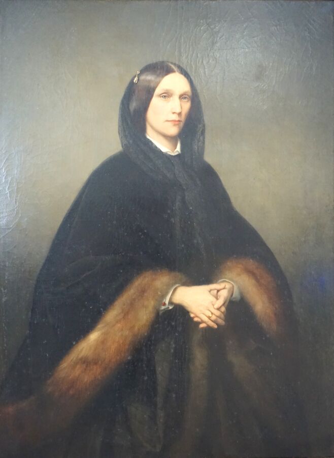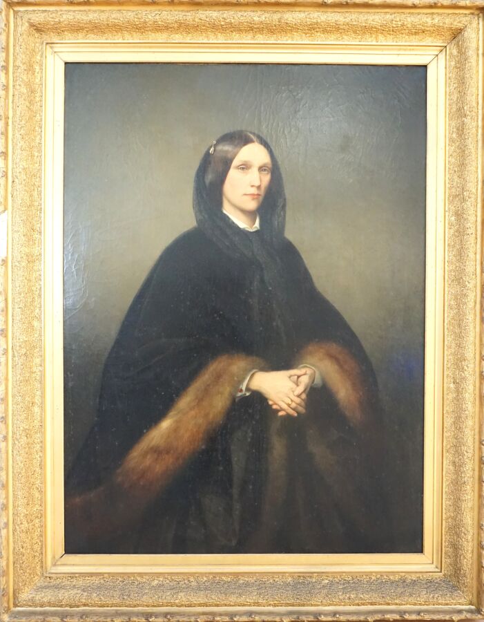 Camille VAN CAMP (1834-1891), "Portrait de jeune femme à la mantille, mains croisés", huile sur toile, 126 x 94 cm.