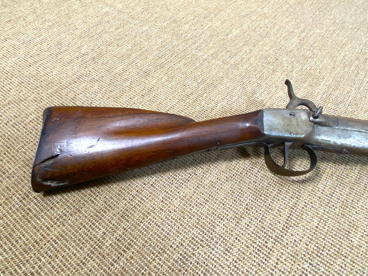 CANARDIERE A BROCHE PERRET AVIRIAT AIN, ouverture à goupille, long canon rond à pans au tonnerre de 185 cm, crosse en noyer (coups et légers manques), mécanisme semblant fonctionnel, longueur totale : 225 cm, milieu XIXème, DANS L'ETAT.
