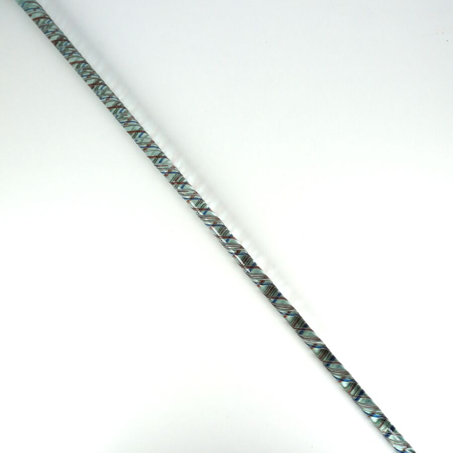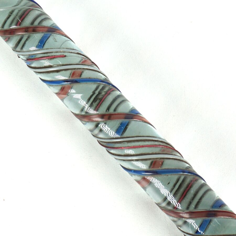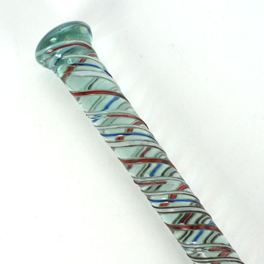 Canne de conscrit en verre spiralé tricolore terminée par un pommeau, Nord de la France, fin du 19e siècle - début du 20e siècle, H. 100 cm.