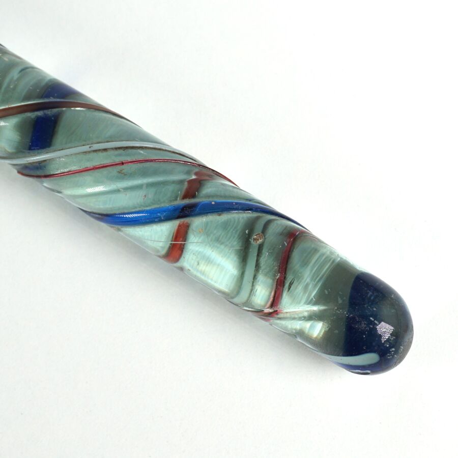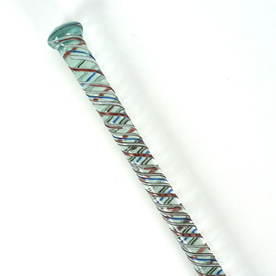 Canne de conscrit en verre spiralé tricolore terminée par un pommeau, Nord de la France, fin du 19e siècle - début du 20e siècle, H. 100 cm.