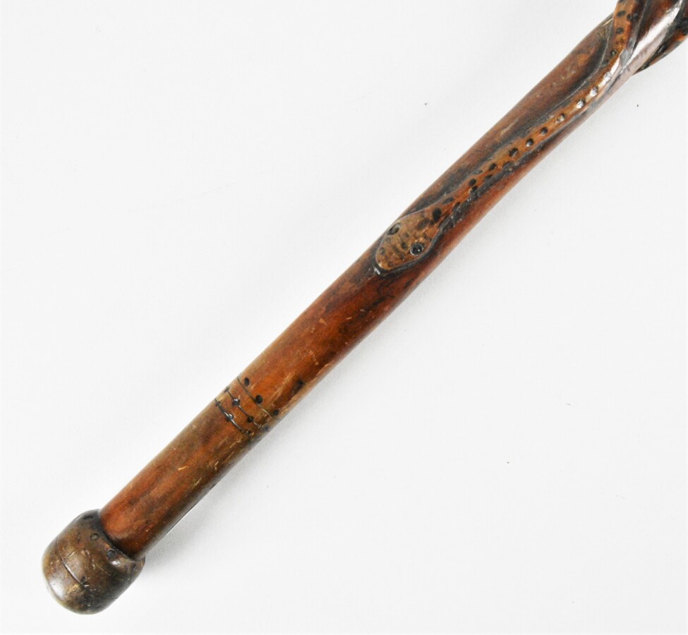 Canne de marche en bois sculpté figurant une serpent enroulé autour du bâton, H. 89 cm (légères usures).