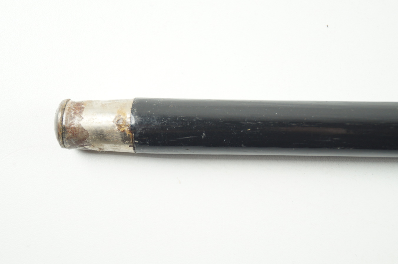 Canne de procession à pommeau en bakélite terminé par une médaille en métal argenté du pèlerinage montfortain à Lourdes, il dissimule un cierge, bague en métal argenté, fût en bambou noirci agrémenté d'un Christ en croix en métal doré, férule en métal, L. 81 cm. (désargentures et petites fentes)