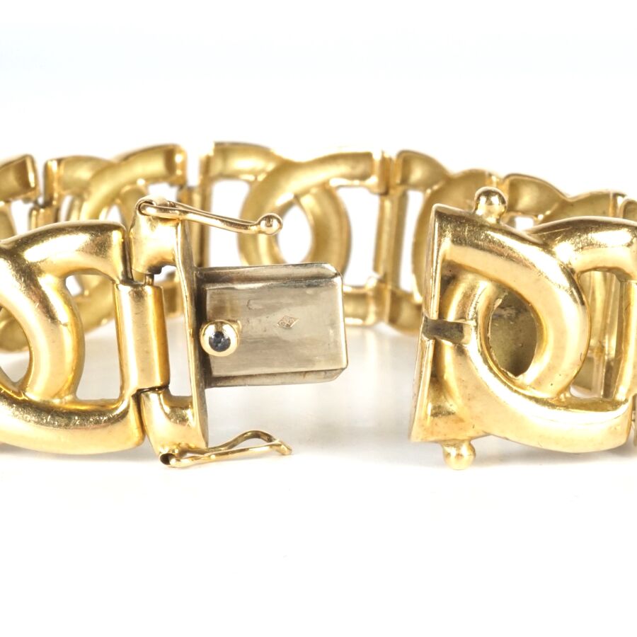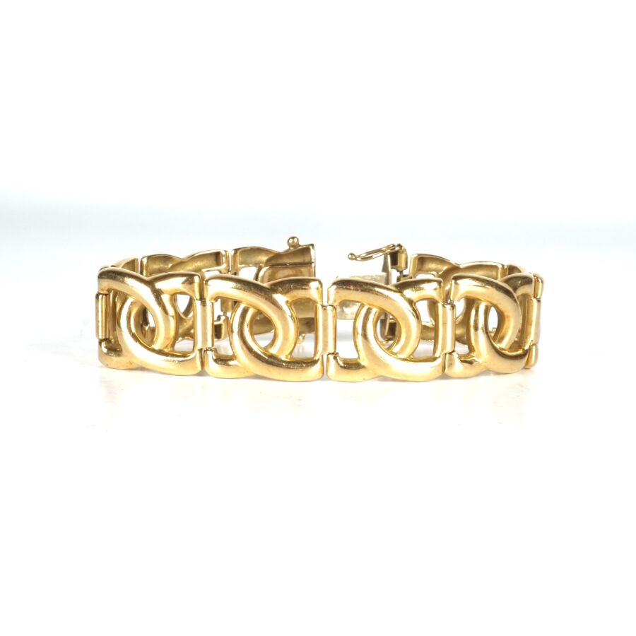 CAPLAIN PARIS : Bracelet articulé en or jaune 18K (750/oo), à motif entrelacé, fermoir à cliquet et double 8 de sécurité, signé, Larg. 1.6 cm. L. Poignet : 16.7 cm. L. Totale : 17.7 cm. Poids brut : 38.3 g environ (un maillon supplémentaire).