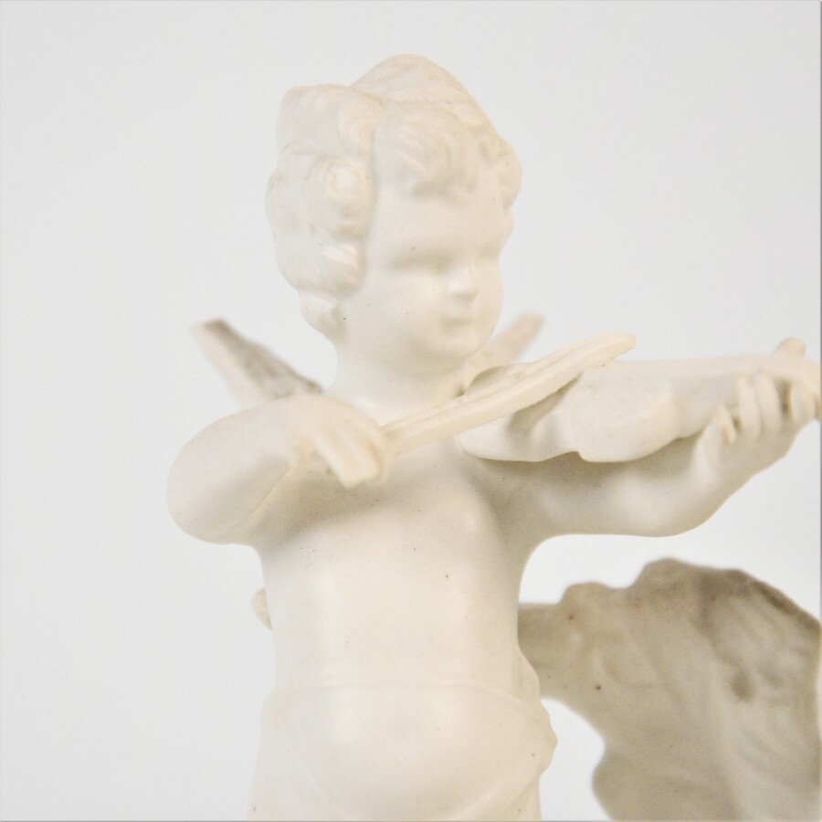 CAPODIMONTE : "Deux angelots musiciens", groupe en biscuit blanc, marque au "N" couronné au revers, 20e siècle, H. 15 cm (manque à un petit doigt au flutiste et une pointe aux ailes du violoniste).