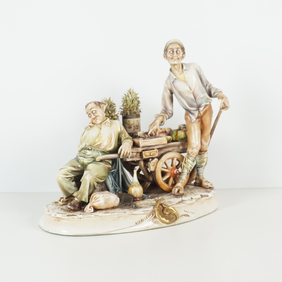 CAPODIMONTE : Ensemble de deux groupes, porcelaine polychrome, représentant une conversation en intérieur pour l'un et deux hommes au chariot pour le second, marqués, L. 30 cm et L. 15 cm.