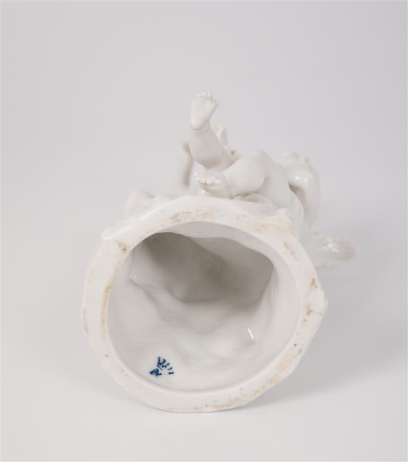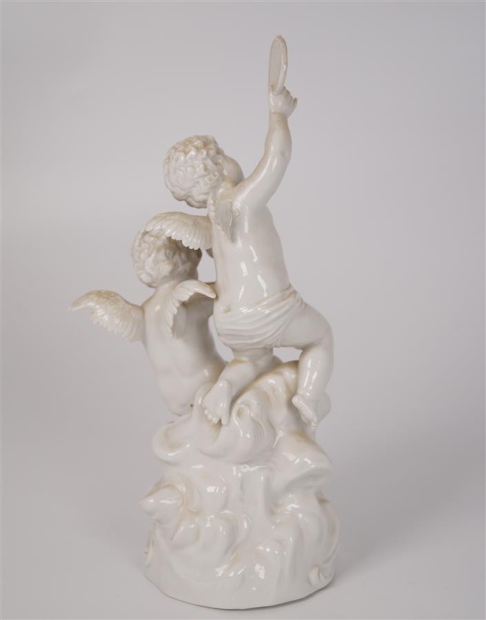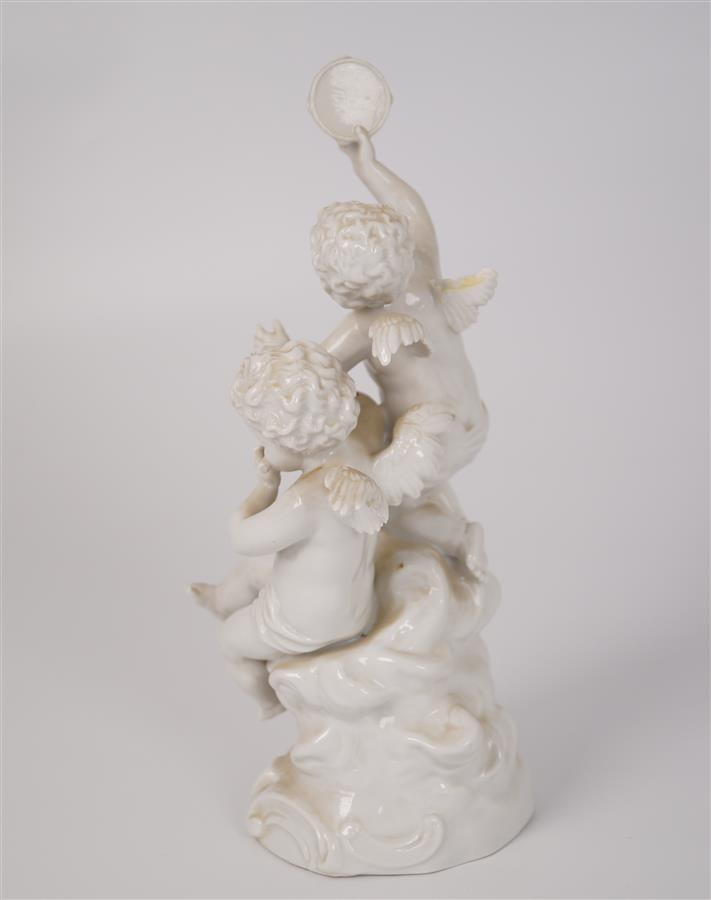 CAPODIMONTE : "Putti musiciens au tambourin et à la flûte", groupe en porcelaine blanche émaillée, marque au "N" couronné à l'intérieur, H. 22,5 cm (accident et manque à une aile)
