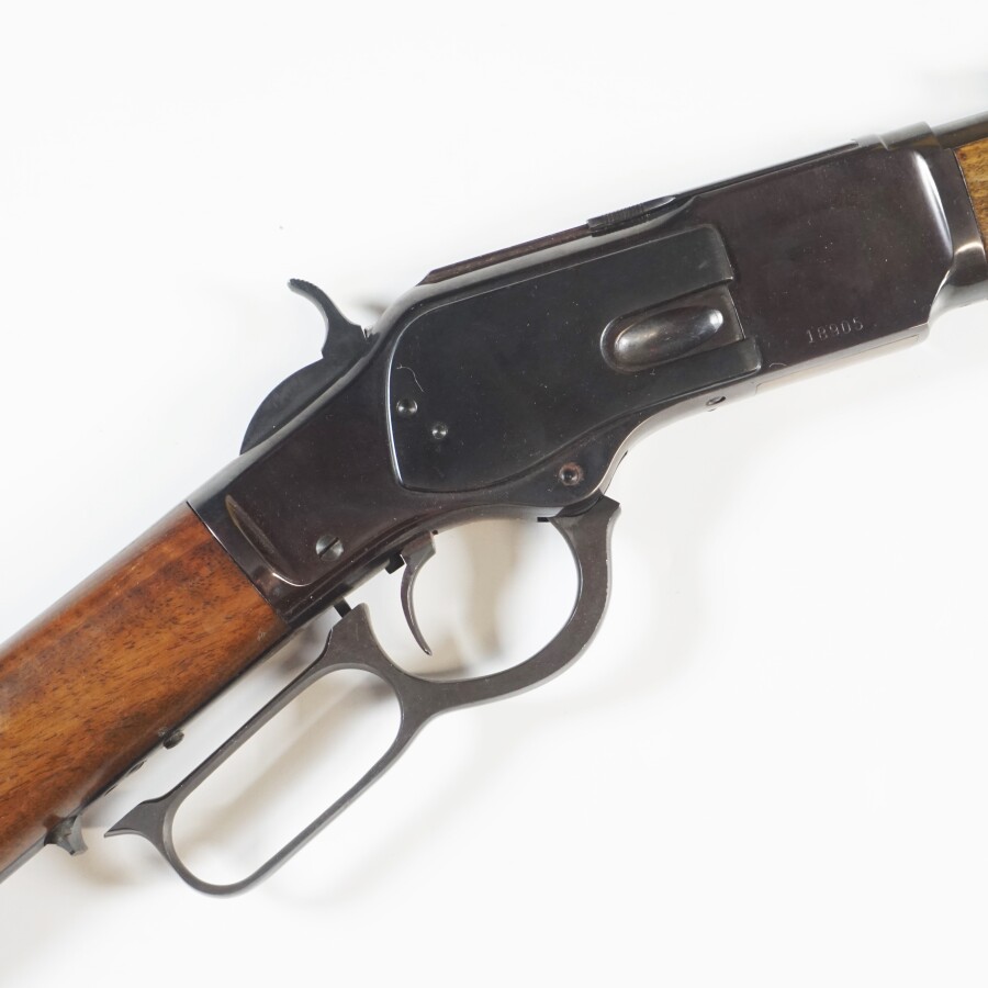 CARABINE A REPETITION MANUELLE DE MARQUE NAVY ARMS, MODELE 1873 CARBINE, calibre 44-40 WIN, percussion centrale, crosse en noyer, boitier de culasse renforcé en acier et partie en laiton, canon rayé de 46,5 cm, magasin tubulaire sous le canon, levier d'armement sous la garde, hausse rabattable, arme numéro 18905, catégorie C soumise à déclaration, mécanisme semblant fonctionnel, longueur totale : 97,5 cm, BE.