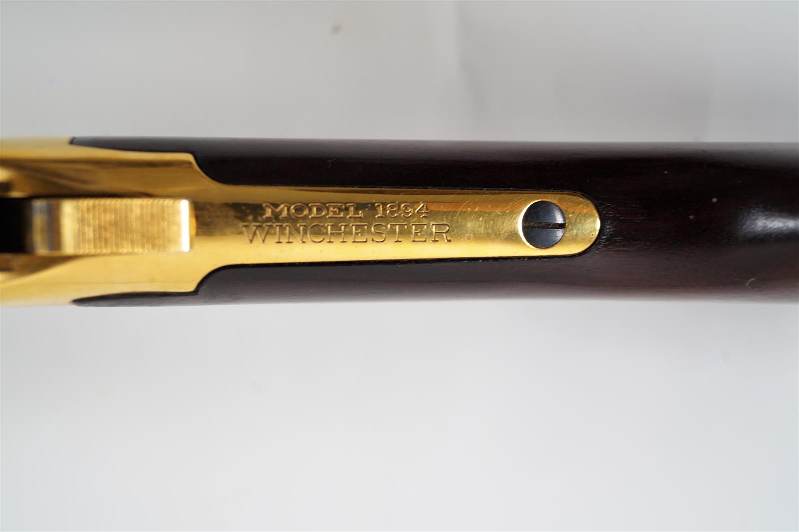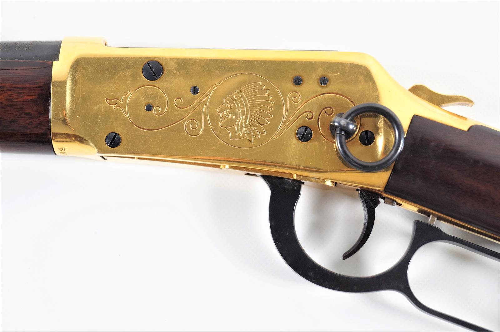 CARABINE COMMEMORATIVE DE MARQUE WINCHESTER MODELE 94 - MODELE COMMEMORATION YELLOW BOY INDIAN CARBINE, calibre 30/30 WIN, levier d'armement sous garde, boitier de culasse doré avec anneau de selle, canon en acier bronzé noir de 50 cm, crosse en bois, arme numéro YB899, catégorie C soumise à déclaration, longueur totale : 97,5 cm, TBE.