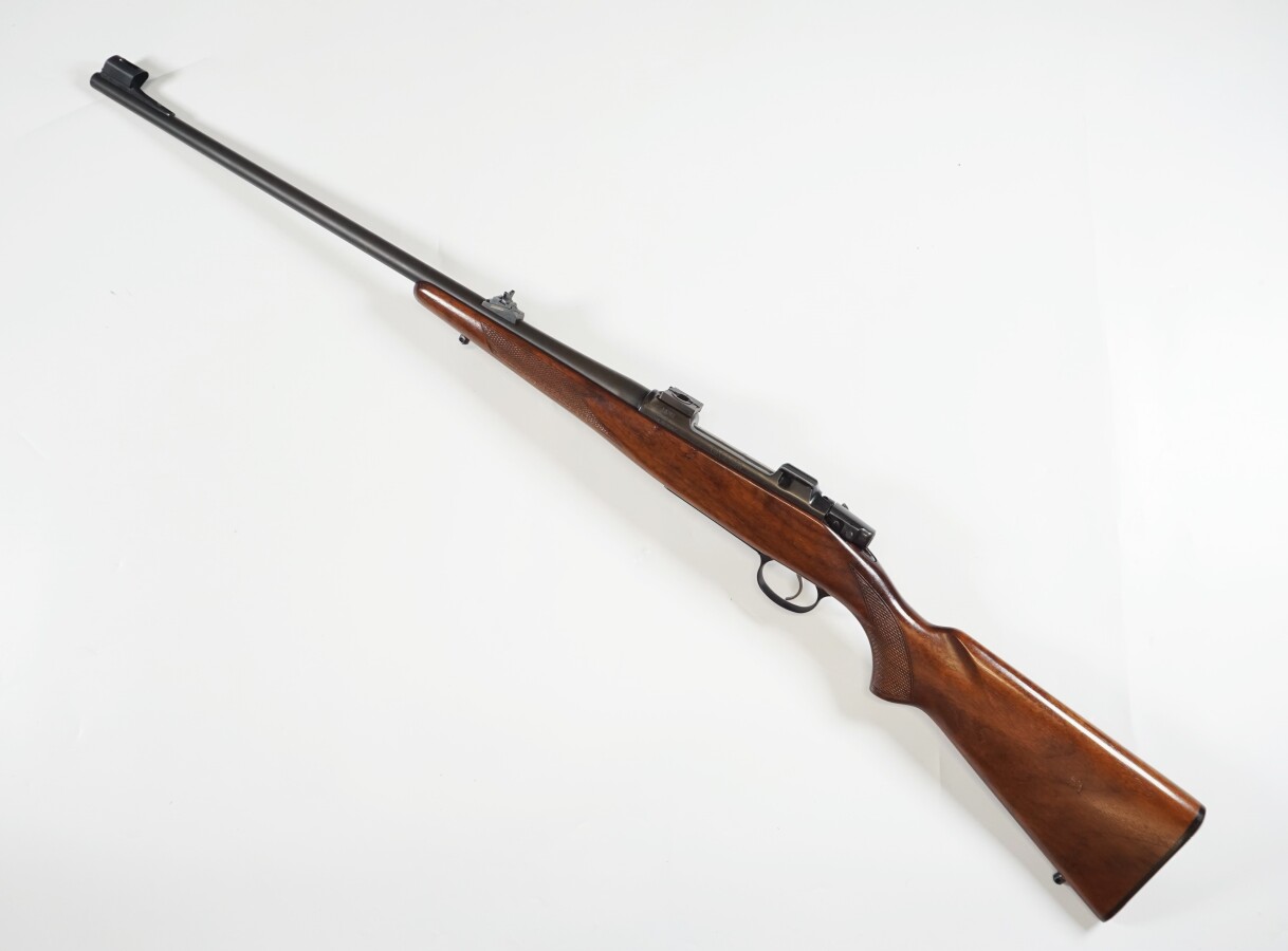 CARABINE DE CHASSE A VERROU DE MARQUE BRNO, MODELE 550, calibre 7x64, 5 coups, canon rayé en acier bronzé noir de 58,5 cm, hausse réglable, crosse pistolet ambidextre de 34,5 cm en noyer en partie quadrillé, arme numéro A8792, catégorie C soumise à déclaration, mécanisme et canon semblant en très bon état, longueur totale : 111 cm, BE/TBE.
