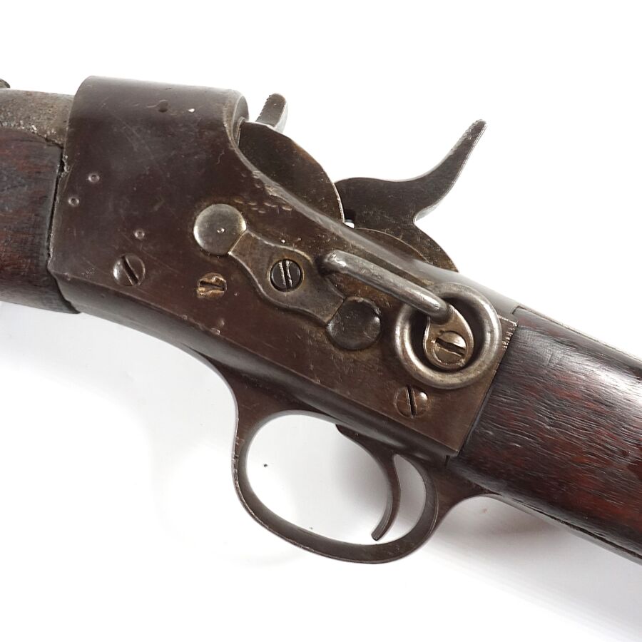 CARABINE DE SELLE DE MARQUE REMINGTON A SYSTEME ROLING BLOCK, calibre indéterminé (11 mm égyptien ?), boitier de culasse bronzé avec anneau de selle, queue de culasse marquée sur 3 lignes " REMINGTON ARMS CO, ILION.N.Y. U.S.A., PATENTED OCTR. 23nd 1901 ", canon piqué de 48 cm, petite hausse réglable, crosse en noyer à garnitures en fer (mauvais état), mécanisme semblant fonctionnel, canon bien rayé mais piqué, longueur totale : 90.5 cm, DANS L'ETAT.