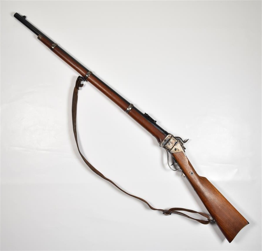 CARABINE DE TIR A POUDRE NOIRE GENRE SHARPS, calibre 54 à poudre noire, un coup, platine à percussion et chien en acier jaspé, canon rond rayé de 74 cm, levier d'ouverture sous détente, garnitures en acier jaspé, crosse en noyer, bretelle en cuir marron, longueur totale : 119 cm, mécanisme en bon état de fonctionnement, TBE.