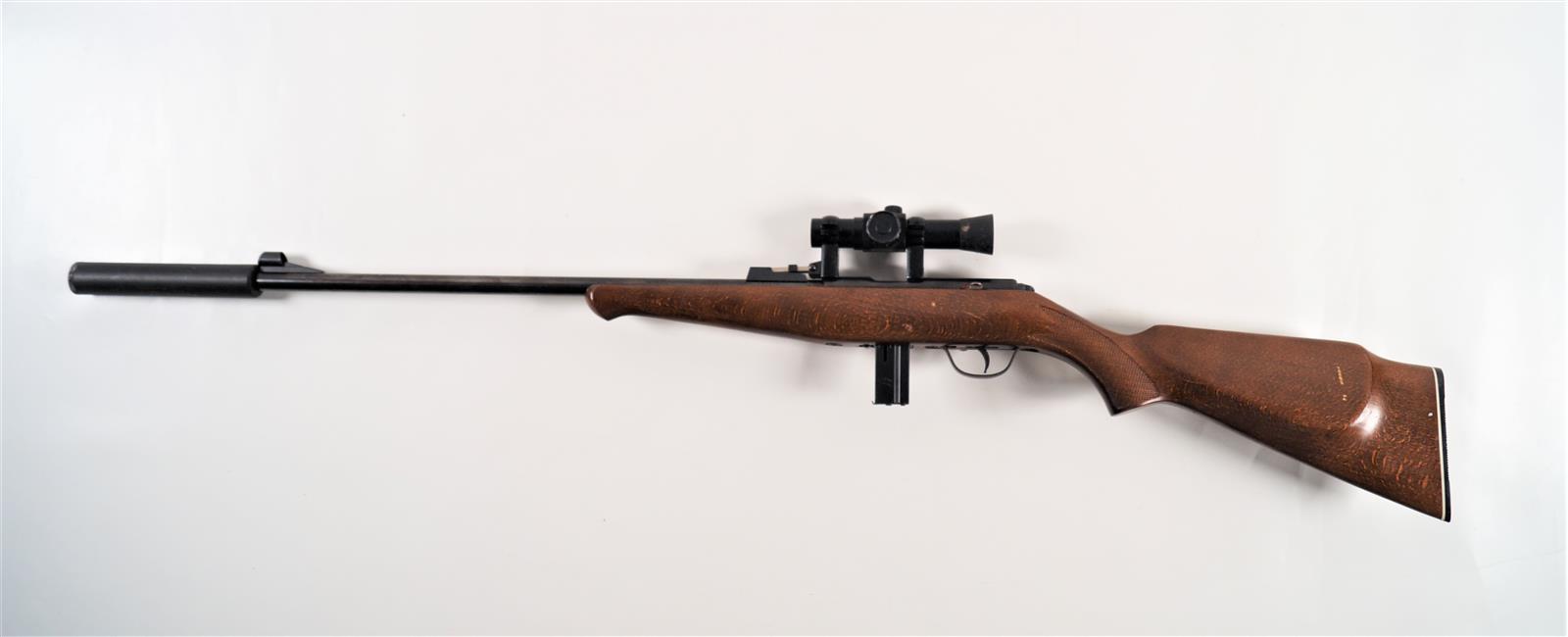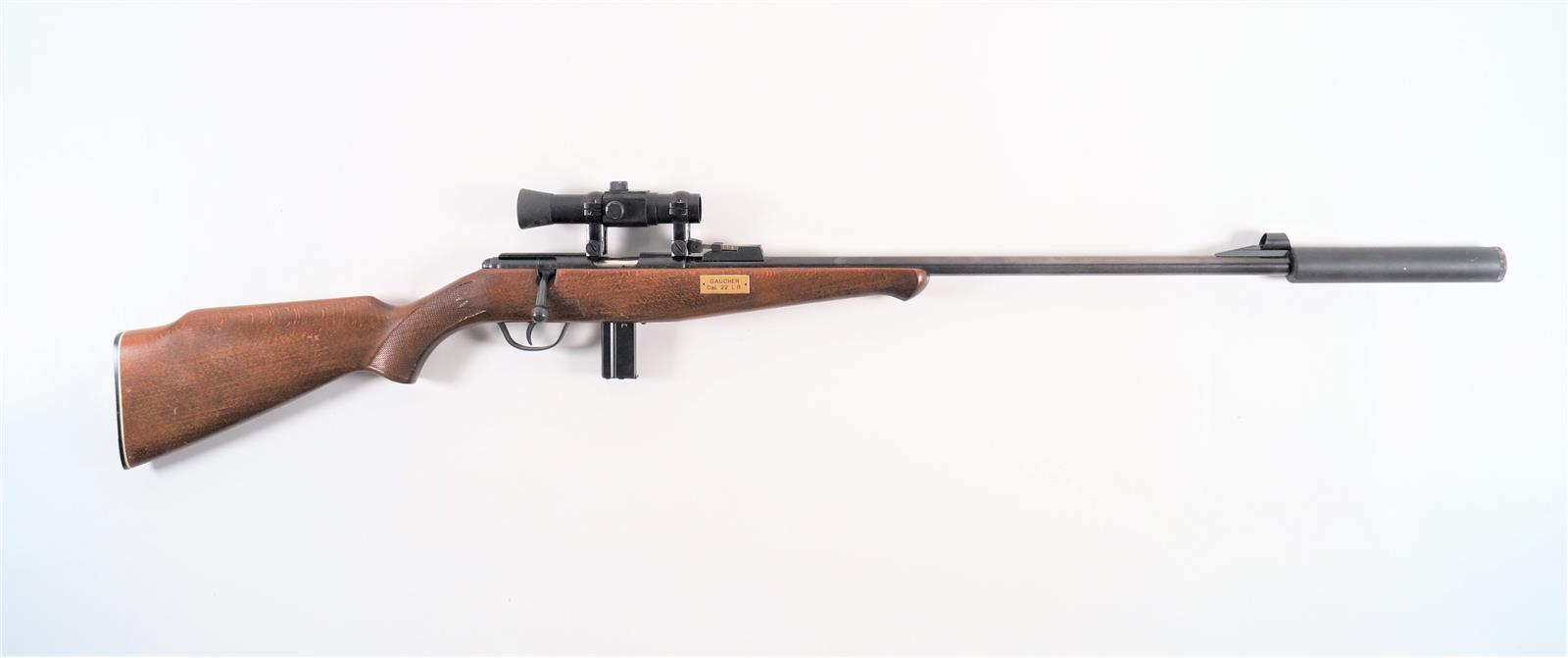 CARABINE DE TIR A VERROU DE MARQUE GAUCHER, calibre 22 LR, chargeur 9 coups, hausse réglable, crosse pistolet à joue en noyer en partie quadrillée, arme numéro 910186, catégorie C soumise à déclaration, mécanisme semblant fonctionnel, avec SILENCIEUX et LUNETTE DE VISEE TBE.