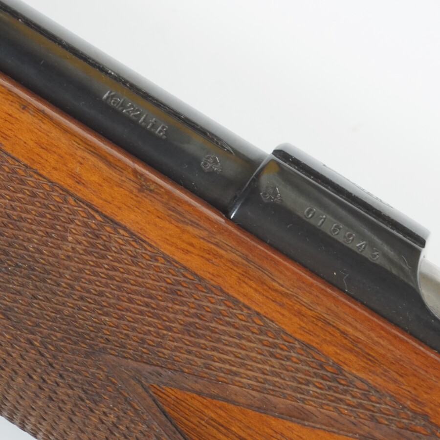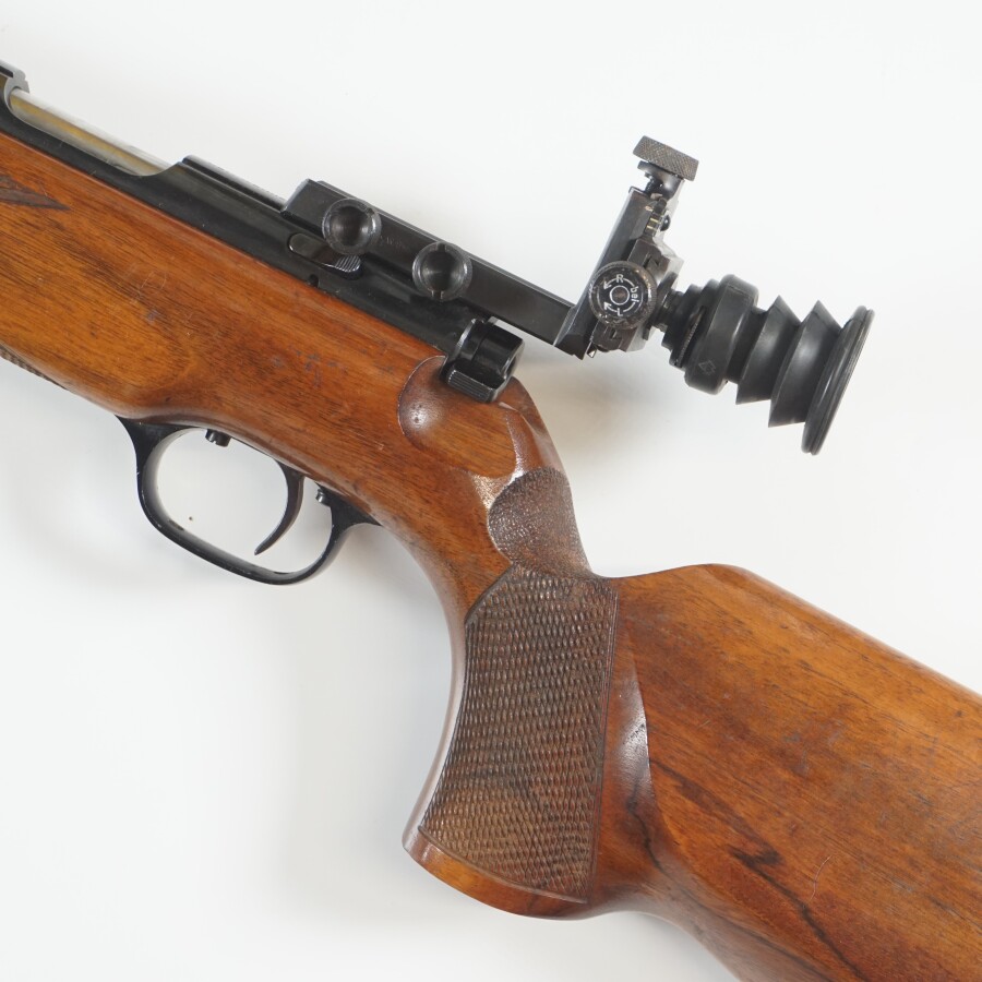 CARABINE DE TIR DE COMPETITION DE MARQUE WALTHER, calibre 22 LR, un coup, dioptre, crosse pistolet à joue en noyer de 35,5 cm pour droitier en partie quadrillée, arme numéro 016945, catégorie C soumise à déclaration, mécanisme semblant fonctionnel, longueur totale : 111 cm, BE.