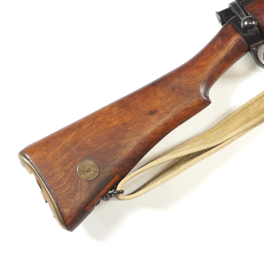 CARABINE DE TIR DE MARQUE LEE ENFIELD, N°2 MK IV de 1917, calibre 22LR, percussion annulaire, monocoup, canon rond rayé de 62 cm, hausse micrométrique, crosse en noyer avec inscription " M47C 1956 ", rapiècement de bois à l'attache de bretelle basse et deux trous sur le dessus du fut, arme numéro G27396 hormis la sécurité, manque le " faux " chargeur, bretelle en épais coton beige, mécanisme semblant fonctionnel, longueur totale : 112 cm, BE.