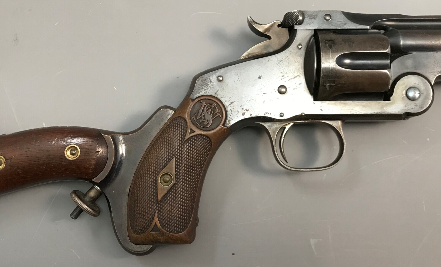 CARABINE REVOLVER DE MARQUE SMITH & WESSON, MODELE 320, calibre 320 SA, 6 coups, simple action, carcasse fermée en acier bronzé noir portant le numéro gravé " 301 ", barillet cannelé à extracteur en étoile, canon de 20 pouces (50,8 cm) sans point de mire, bande du canon marquée, plaquettes de la poignée quadrillées au sigle de la marque, fût en ébonite rouge marbré, crosse amovible en noyer, longueur totale : 91,5 cm, probablement rebronzé, quelques piqûres, BE/TBE.