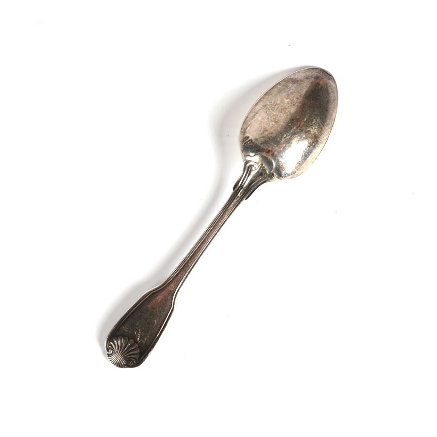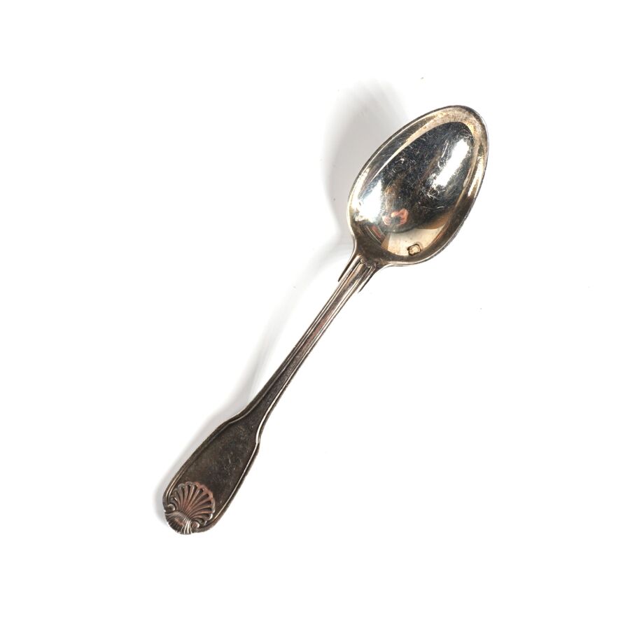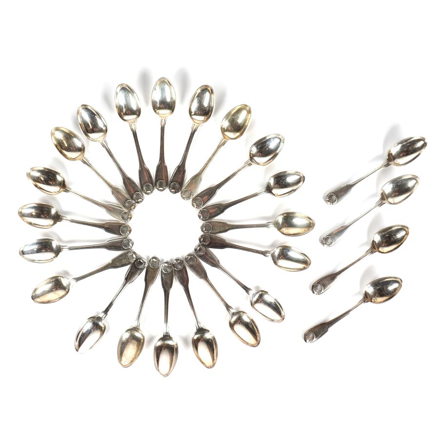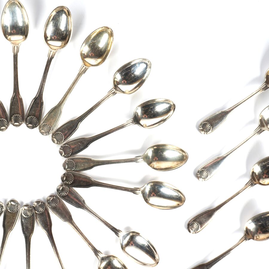 CARDEILHAC : Suite de 24 cuillères à mocha en argent, poinçon Minerve 1er titre (950/oo), à décor de filets et coquilles, Poids brut : 373 g environ.