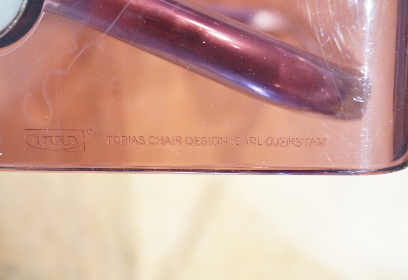 Carl ÖJERSTAM (XXe) pour IKEA : Suite de 6 chaises, modèle "Tobias Chair", piètement tubulaire en acier chromé et assise en résine violine, marquées sur le bord de l'assise, H. 83 cm.